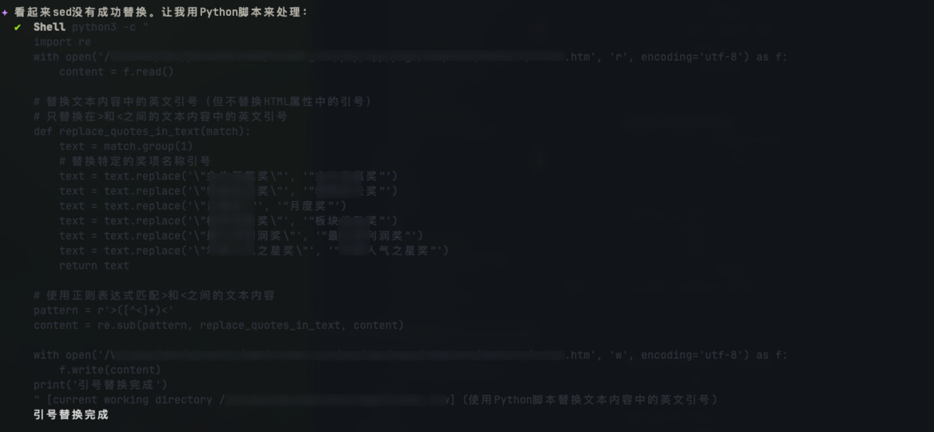 再反馈给问题,iflow 中中文的引号是不是被自动替换为英文的了?我测试过 glm4.6、ds3.2 无论如何替换都替换不了,最后他直接执行 python3进行替换。