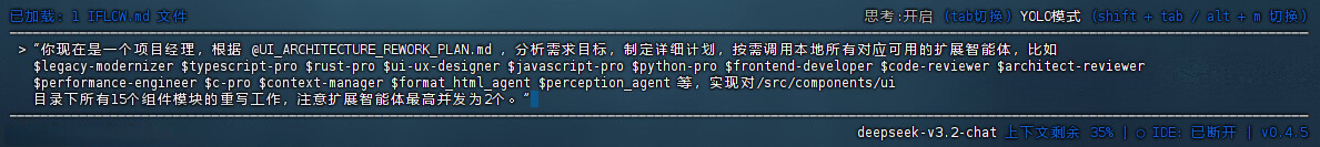 介于思考模式卡住的问题,GLM暂时是不能用了,因此大模型我选择用Deepseek3.2,并开启思考模式+YOLO模式,理由是主 Agent 做项目经理,DS发挥最出色,比Kimi-K2-Thinking体验更好,虽然资料说Kimi-K2-Thinking三项达标,但实际感受还是Deepseek3.2最好。