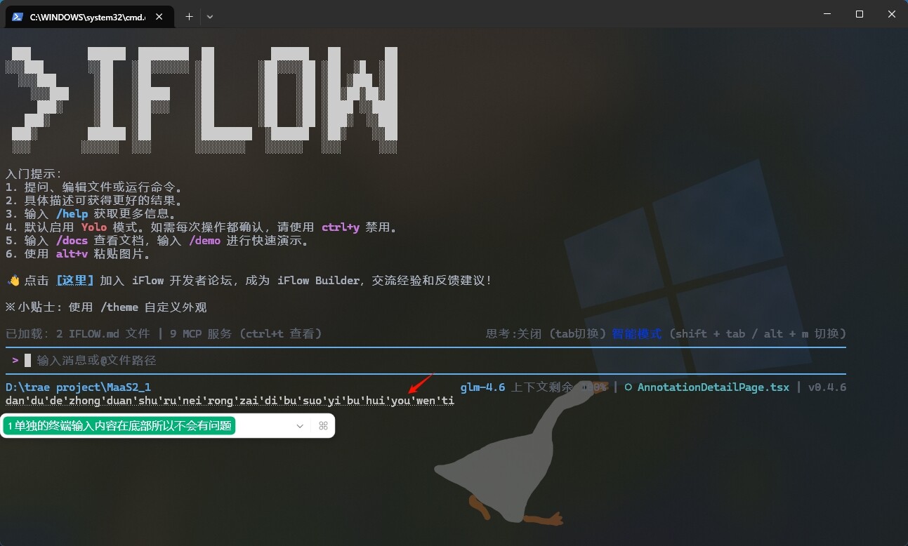 在VS Code或Trae等IDE里使用iflow CLI,无论是在终端里启,还是通过插件启动的,在输入中文时,输入的拼音会出现在最右侧,画面就会向右平移,文字上屏后,画面又回向左平移回来,因此在输入文字时画面就有左右横跳,单独在终端里的就不会有这个问题