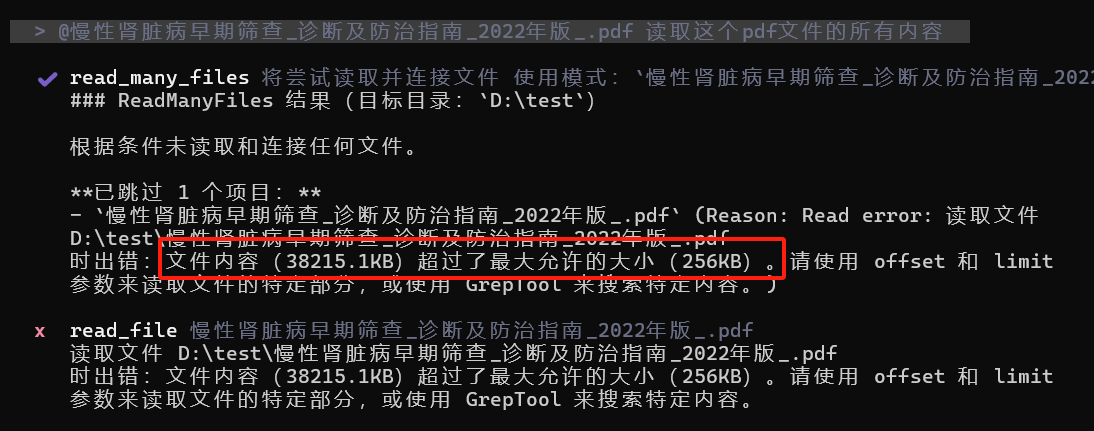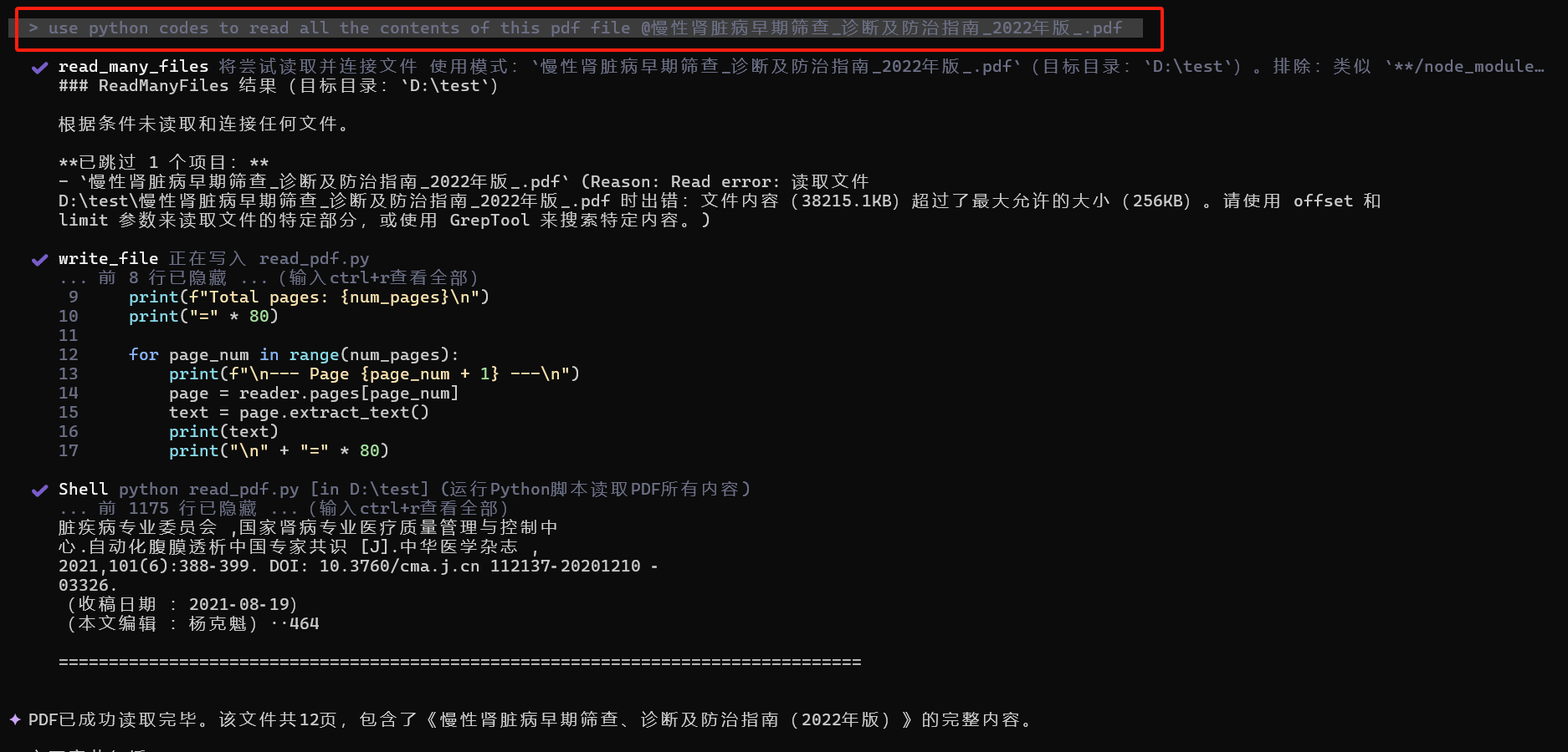 解决方案:让iflow使用python去读取文件。我的提示词是“使用Python代码读取这个PDF文件的所有内容:@慢性肾脏病早期筛查_诊断及防治指南_2022年版_.pdf”
