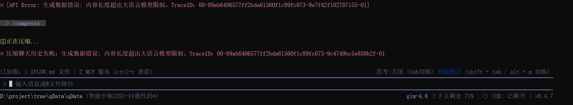 你好,如果自动压缩实效的话,可以先执行命令/compress 进行手动压缩;或者新起一个对话窗口