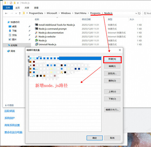 点击编辑,打开编辑环境变量面板 → 点击新建 → 加入node.js 的安装路径