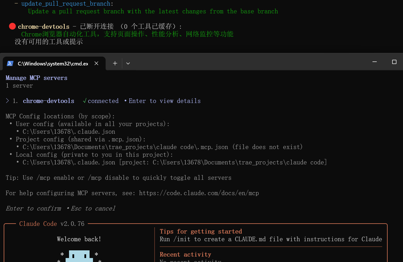 诊断为什么 chrome-devtools 和 ssh-mcp-server 显示断开连接