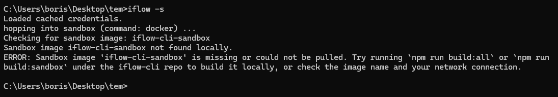 ERROR: Sandbox image ‘iflow-cli-sandbox’ is missing or could not be pulled. Try running npm run build:all or npm run build:sandbox under the iflow-cli repo to build it locally, or check the image name and your network connection.