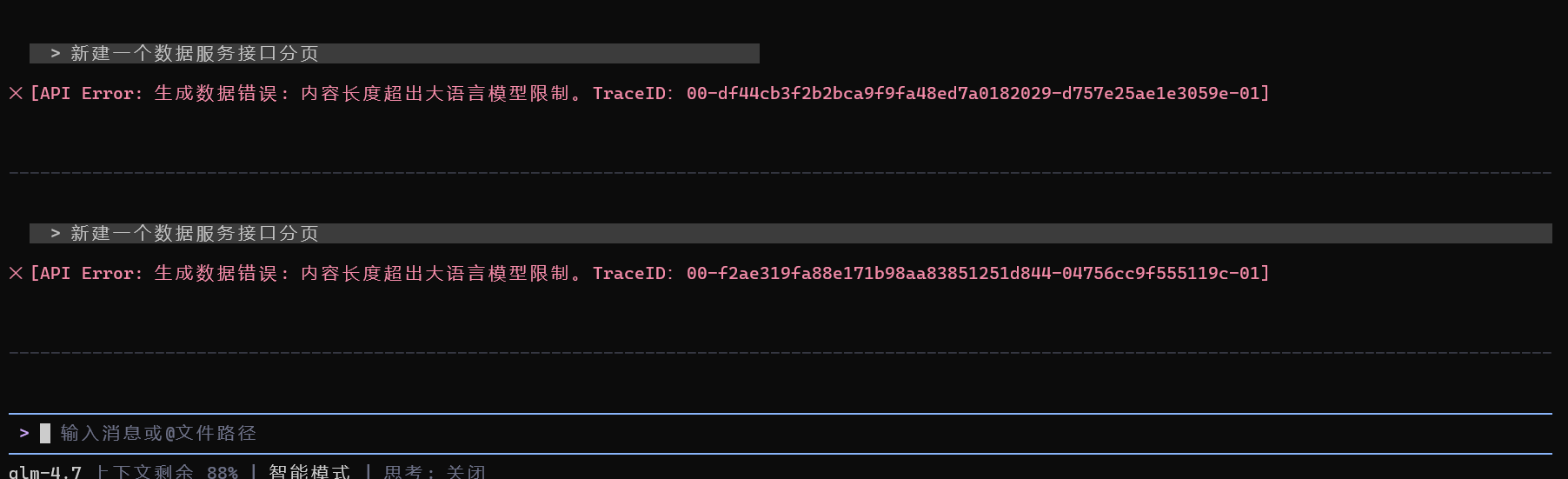 “content”: “Context too long, automatically compressing chat history…”,