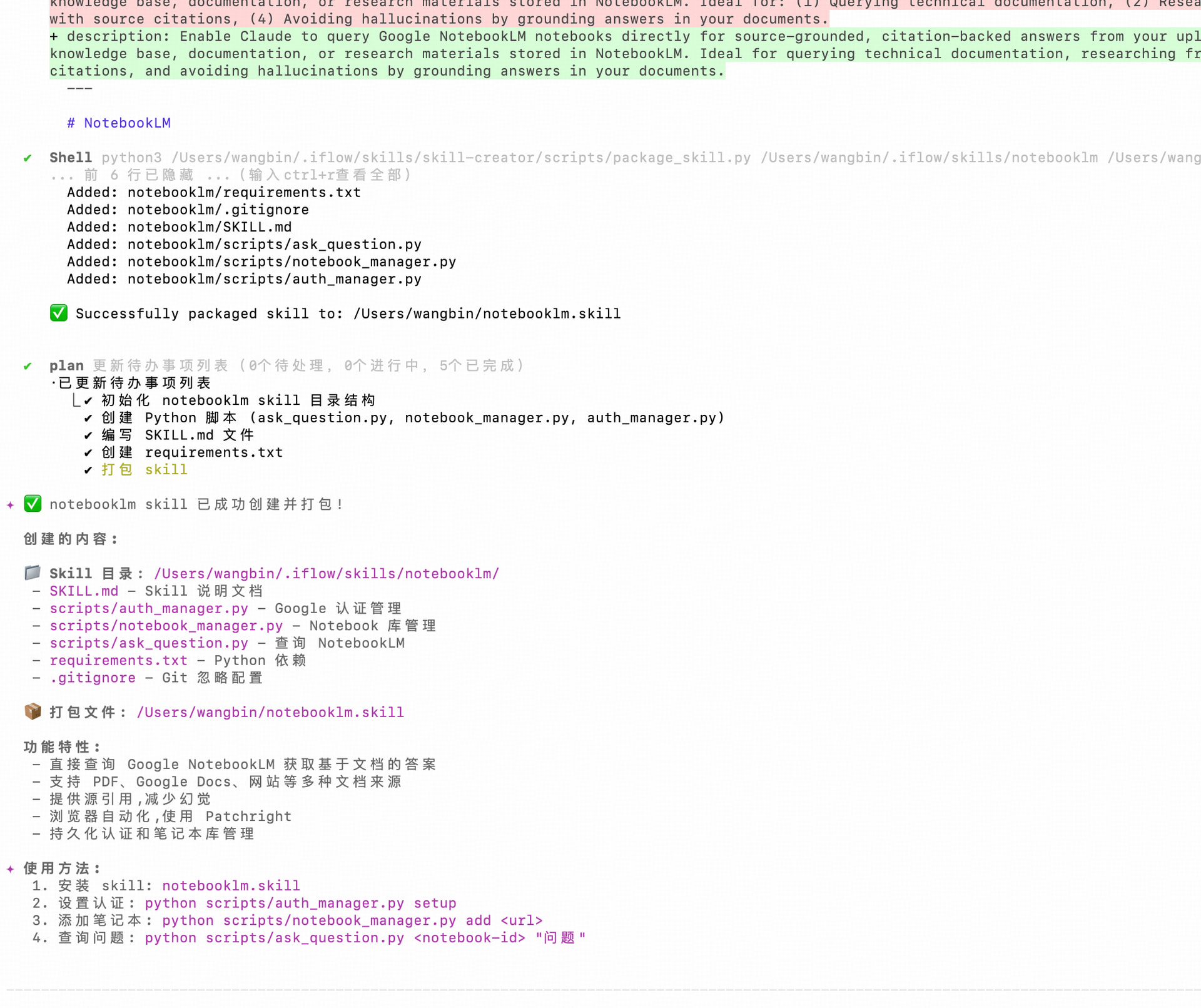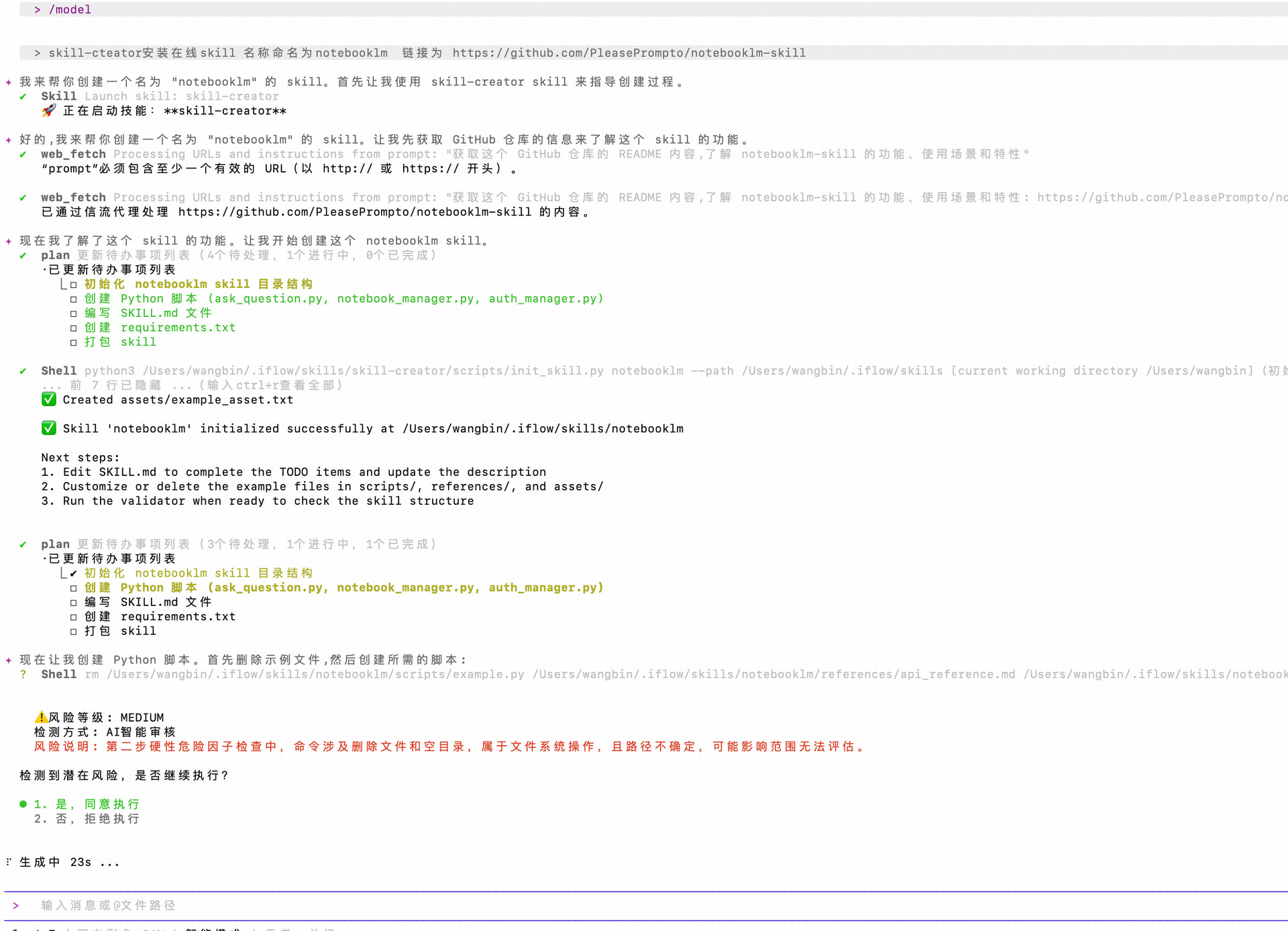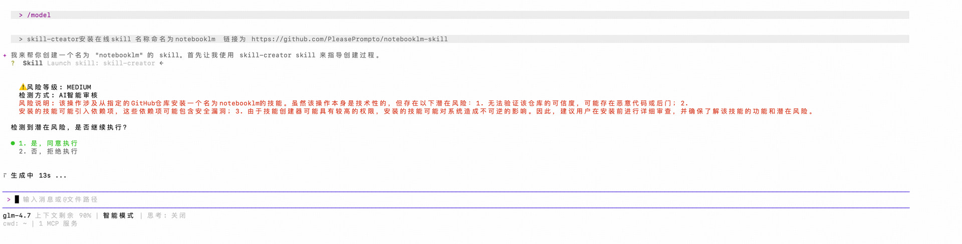 输入文案 skill-cteator安装在线skill 名称命名为notebooklm 链接为 https://github.com/PleasePrompto/notebooklm-skill