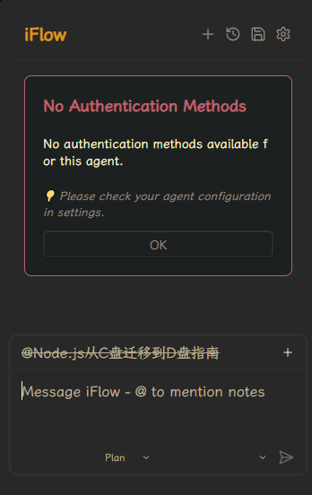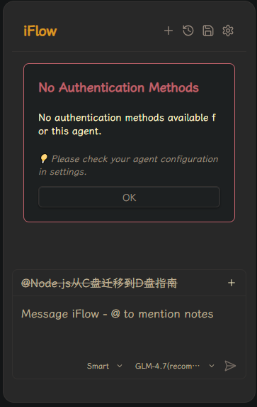 这个acp客户端就会提示iflow没返回任何认证信息。