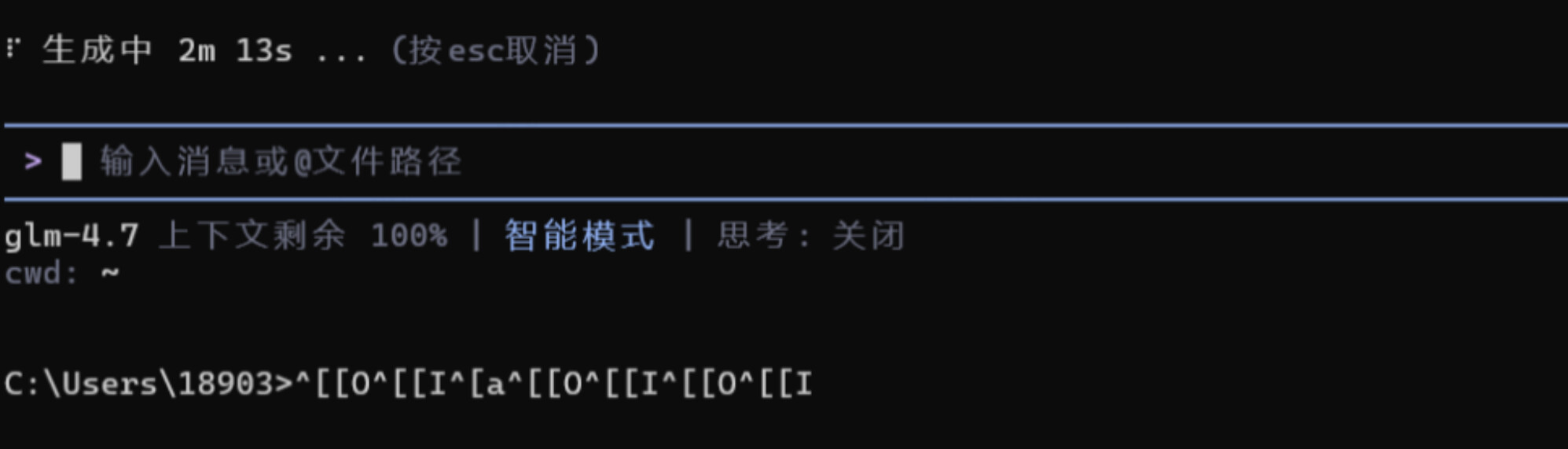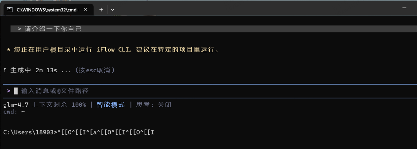 2026年1月27日,今天iflow cli登录成功,输入prompt之后,没有任何提示,几分钟后退出到命令行提示符下,并动态显示乱码;重启、重装都折腾了,仍然不行,请高手指导!!