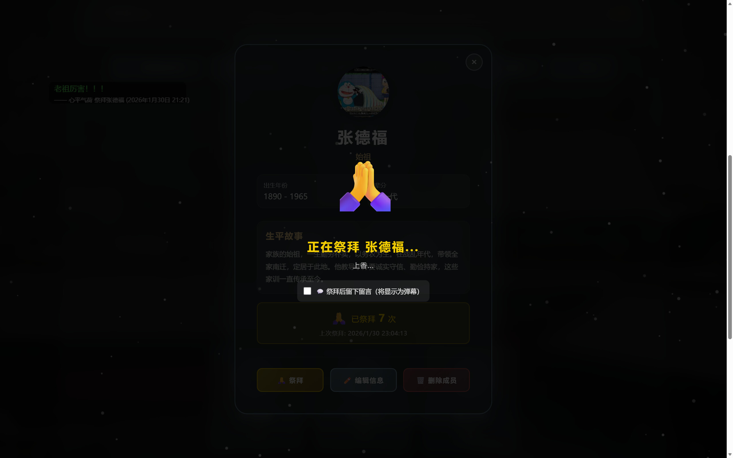 在线祭拜功能 - 支持对祖先进行线上祭拜,增加祭拜次数统计