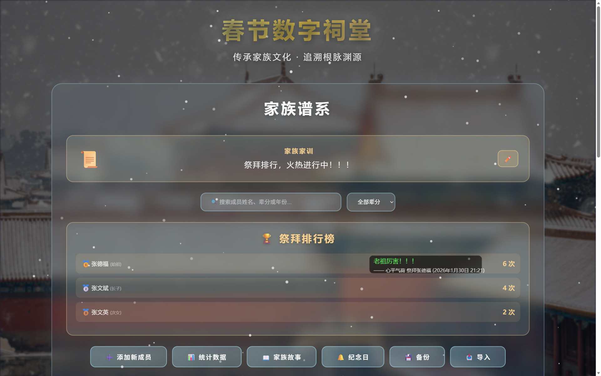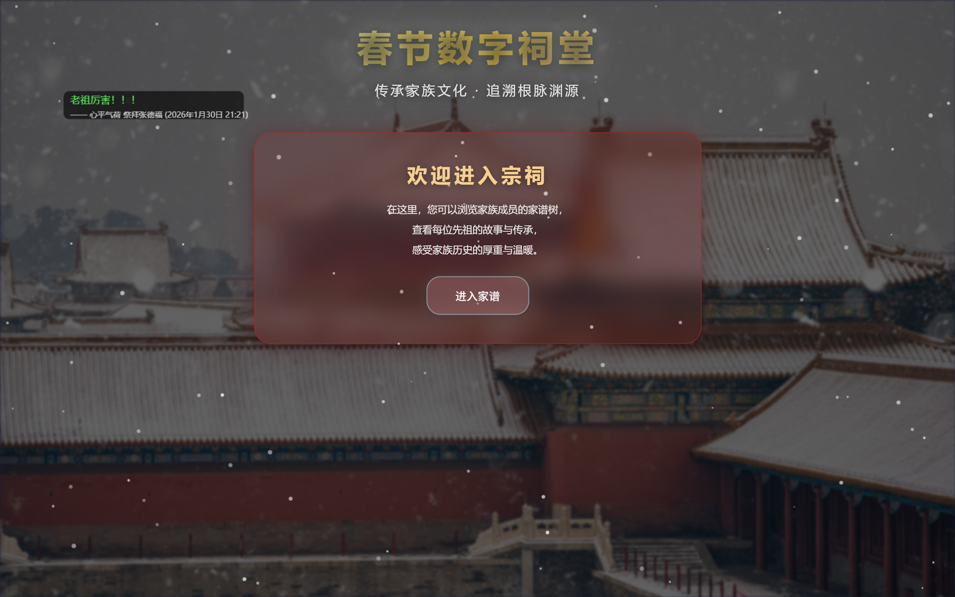 这是一个基于Web技术开发的春节数字祠堂互动展示网页,旨在通过数字化方式传承家族文化,让家人