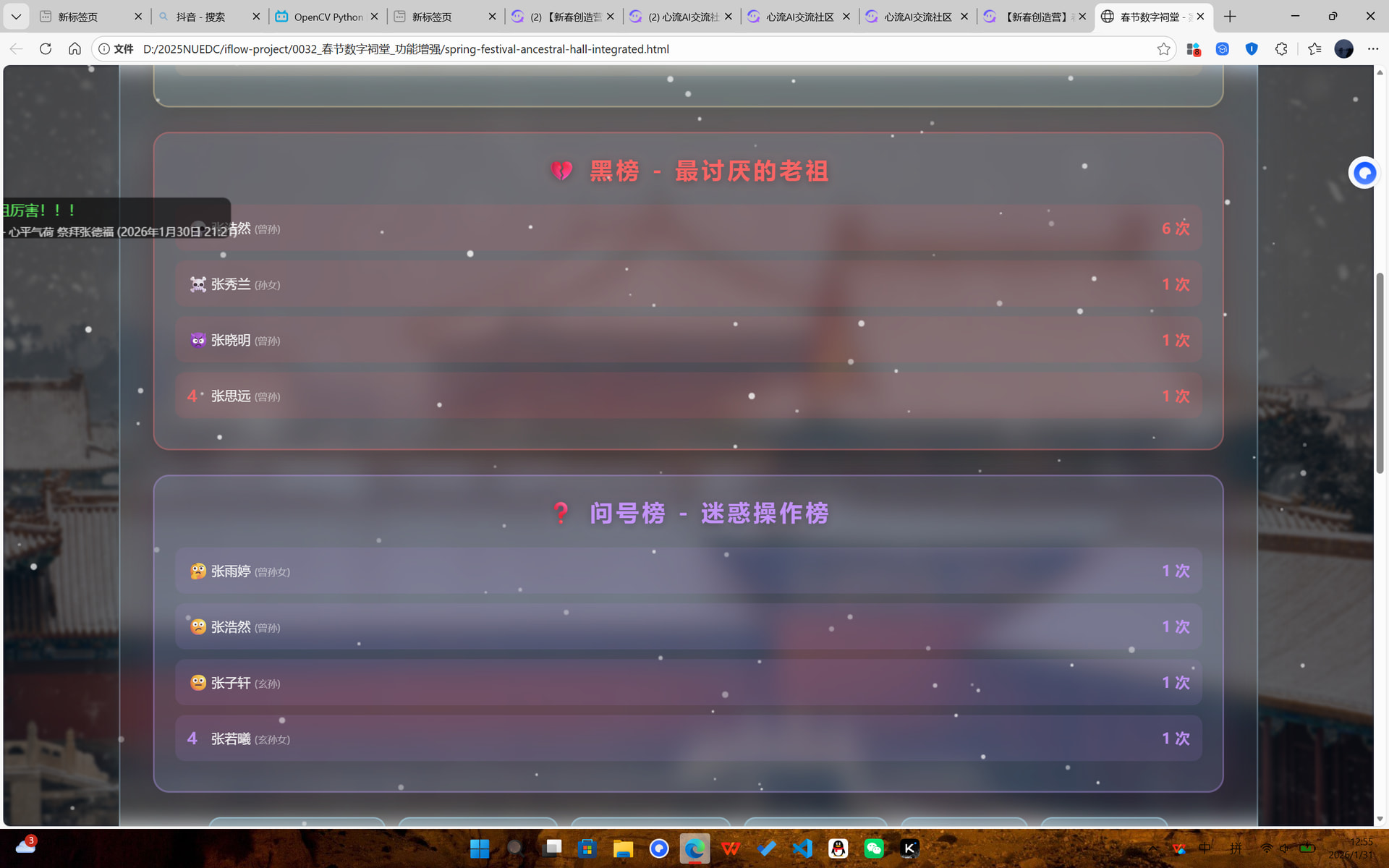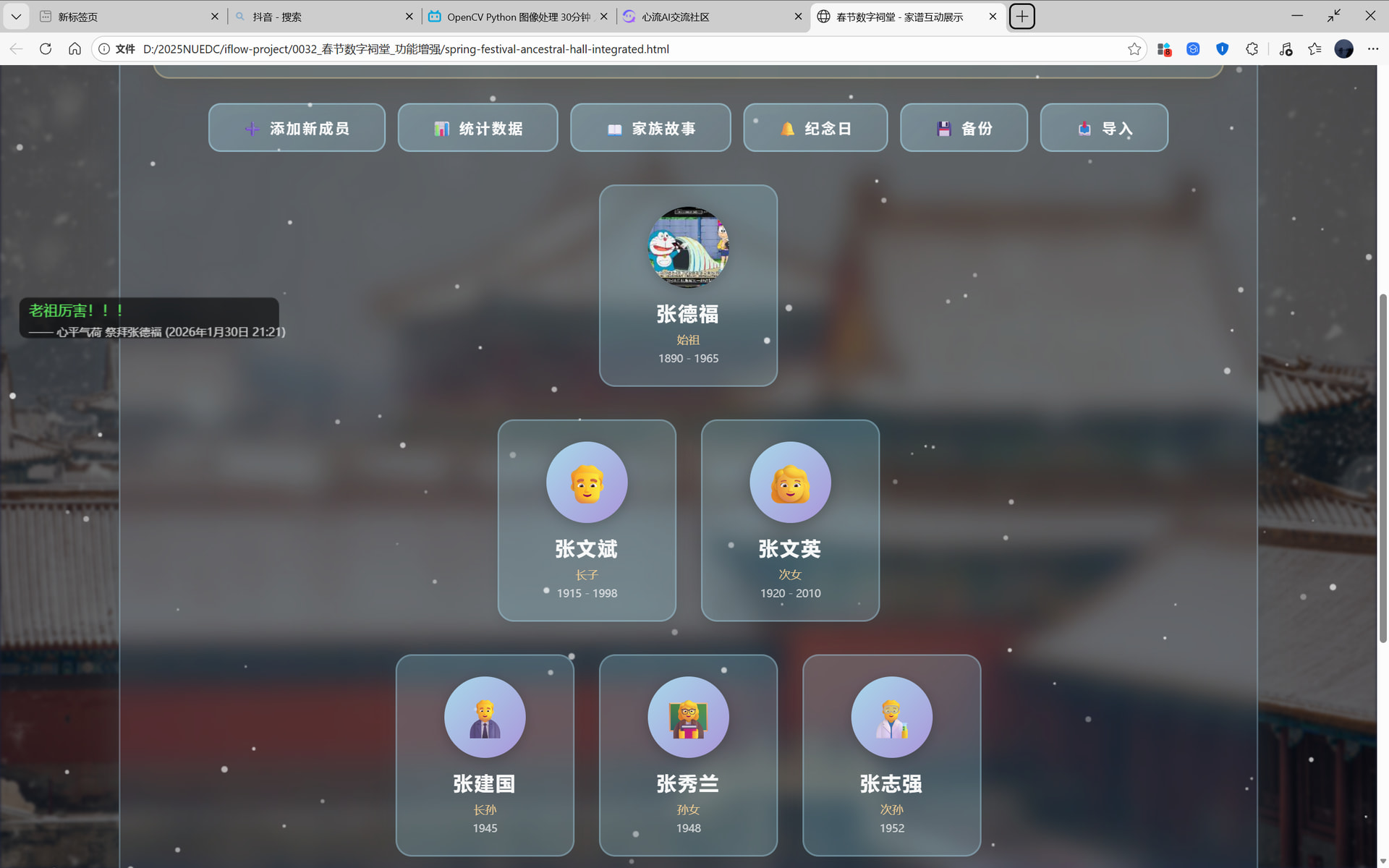 - 确认包含:背景图片(Base64编码)、Canvas飘雪动画、家谱数据、弹幕系统