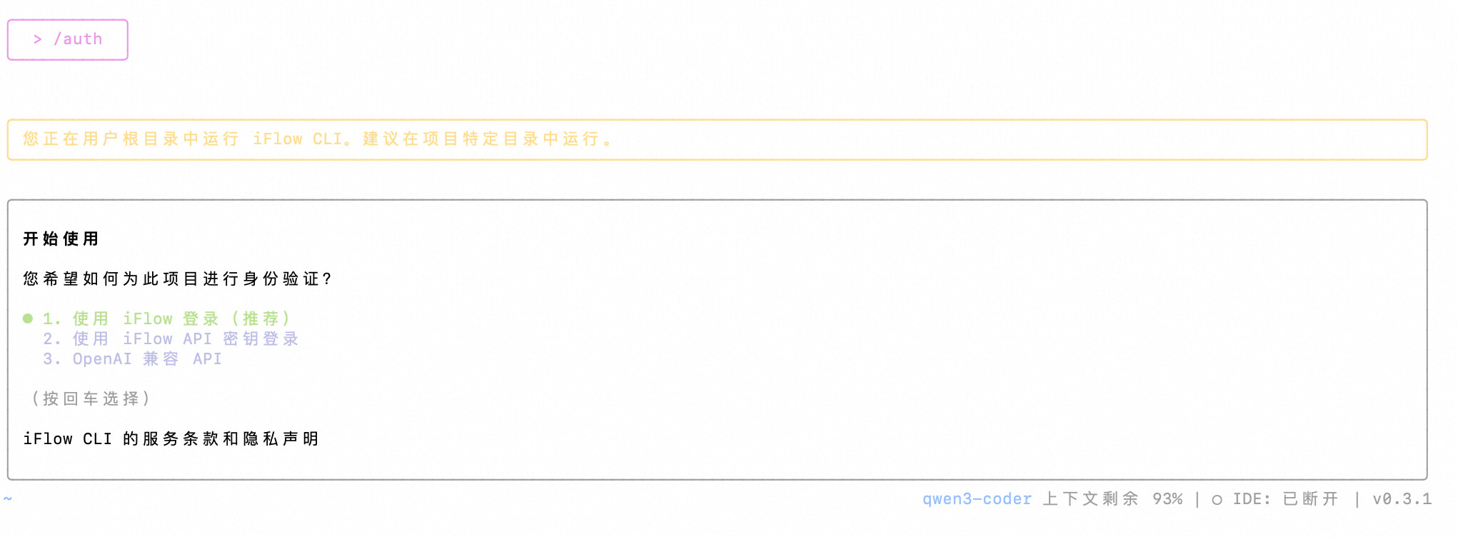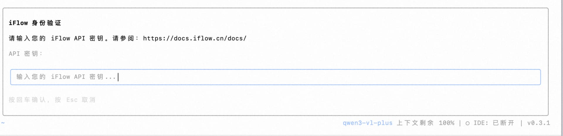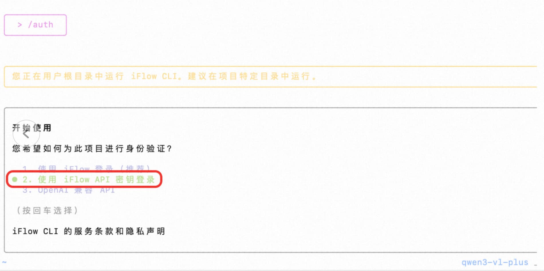 在终端中输入/auth 切换身份验证方式,选择使用 iFlow API 密钥登陆,输入复制的 API key