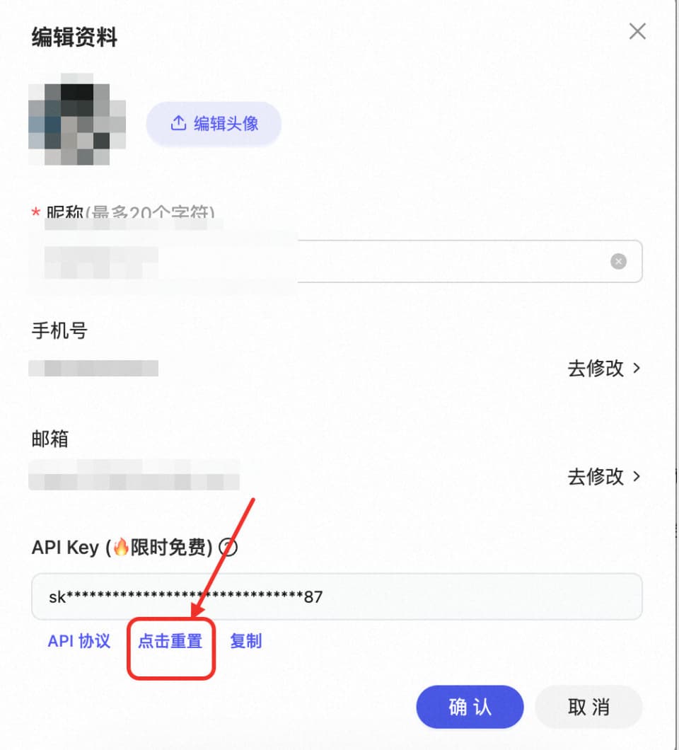 Key 回到心流平台 https://iflow.cn/ 重置 API Key ,点击复制: