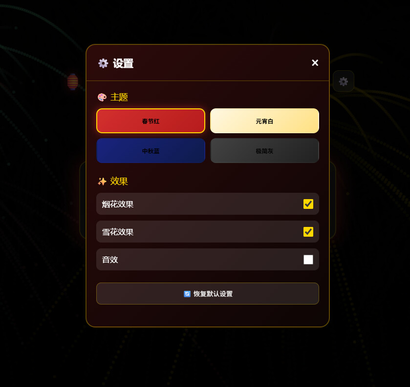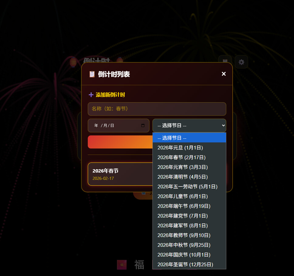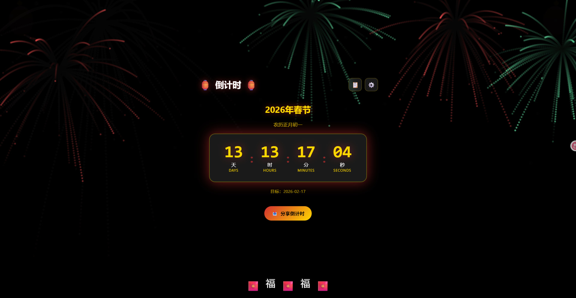 一个精美的春节倒计时网页,展示距离春节的倒计时,支持个性化设置和动画效果。