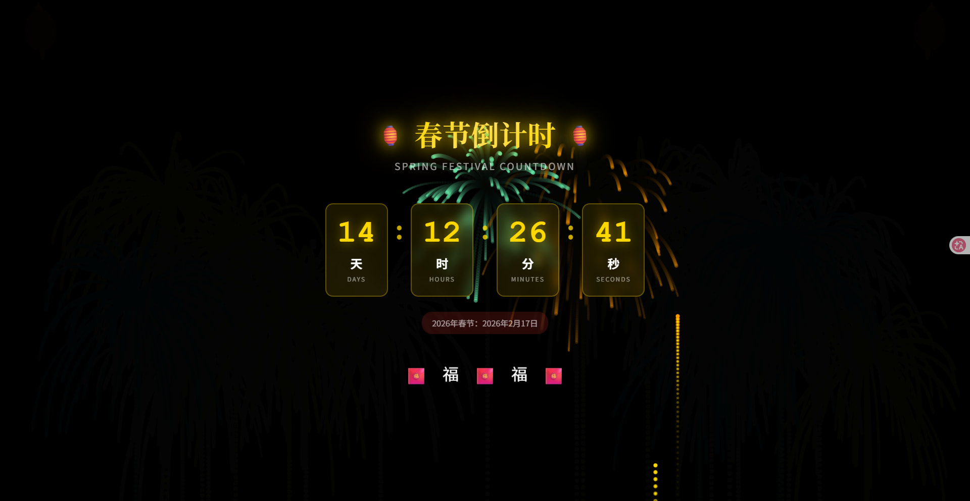 - 实时显示距离春节的倒计时(天、时、分、秒)
