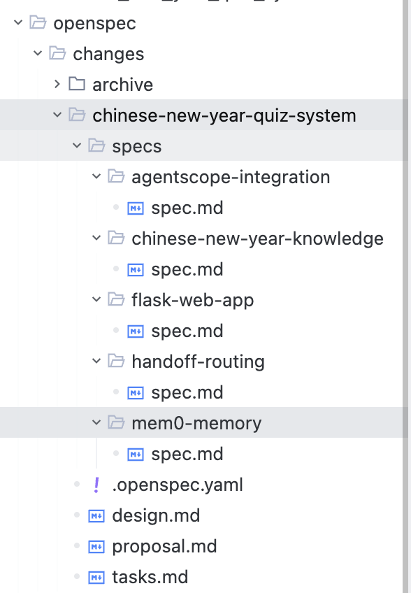 应该使用SDD工具去规划这样子文档会很清晰,我分享一下我的春节问答系统SDD创建的规划文件
