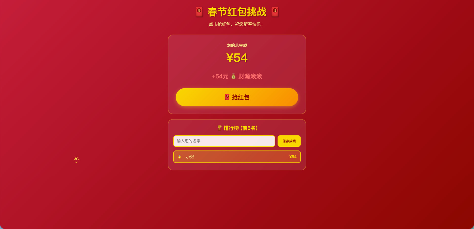 这是一个春节主题的网页小游戏,用户可以在页面上点击“抢红包”按钮,每次抢到随机金额红包,同时获得祝福语。页面累加用户总金额,并显示排行榜,前 5 名玩家的总金额会被保存到浏览器 localStorage 中。页面风格浓厚的春节元素:红色背景、金色按钮、红包动画和彩色文字,让寒冬也充满年味。