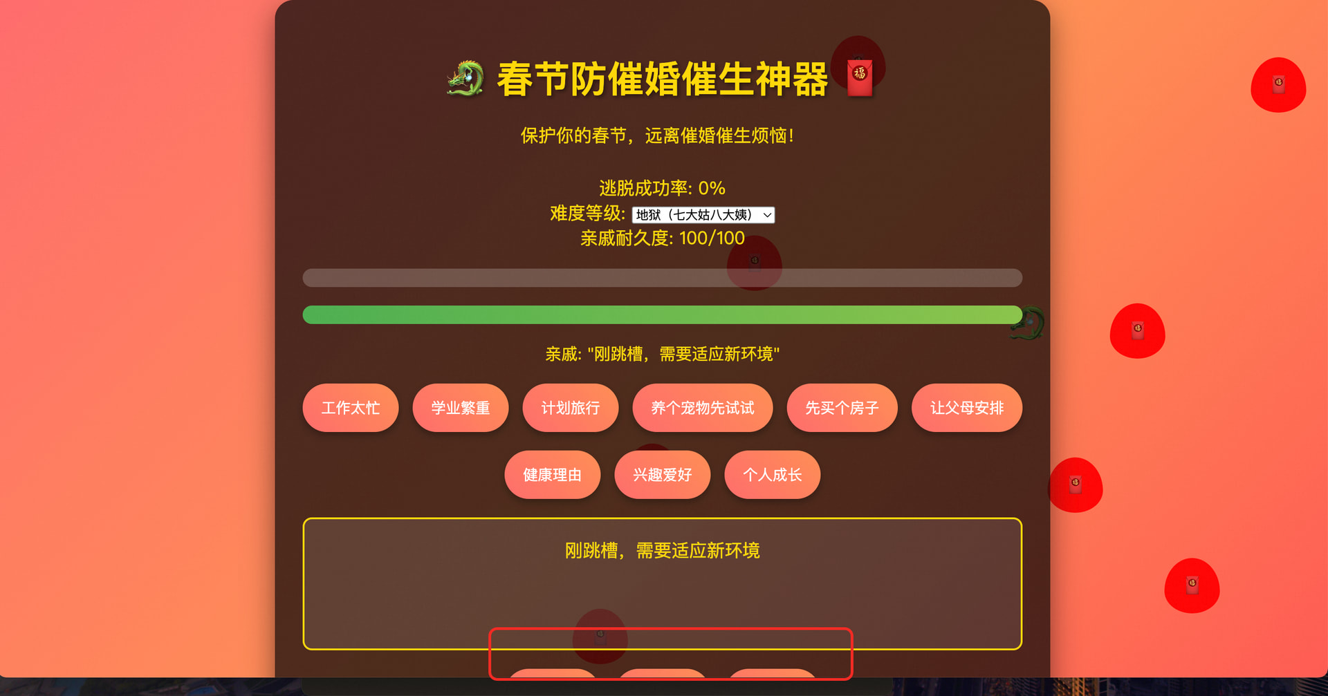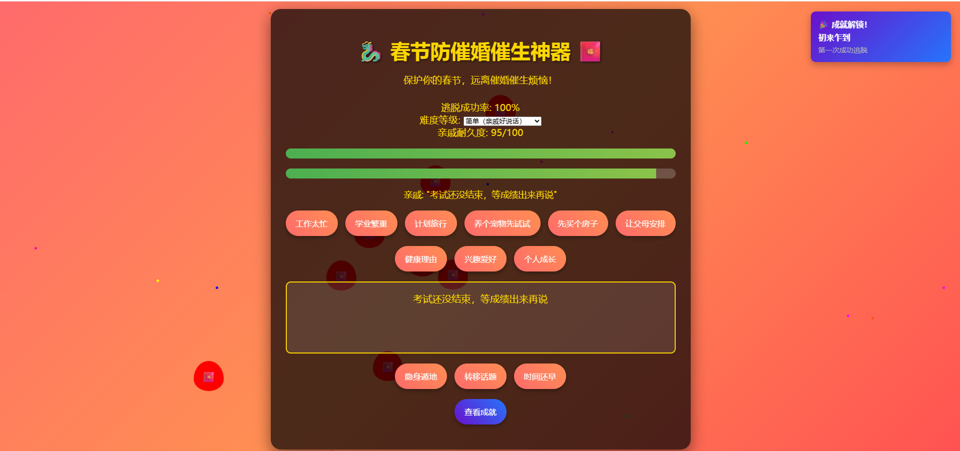 春节防催婚催生神器是一个游戏化的网页应用,旨在帮助用户应对春节期间来自亲戚的各种催婚催生压力。通过游戏化的方式,用户可以学习和练习各种应对策略,提高自己的“逃脱”成功率。应用融合了春节元素,包括红色主题、烟花效果、红包动画等,营造浓厚的节日氛围。