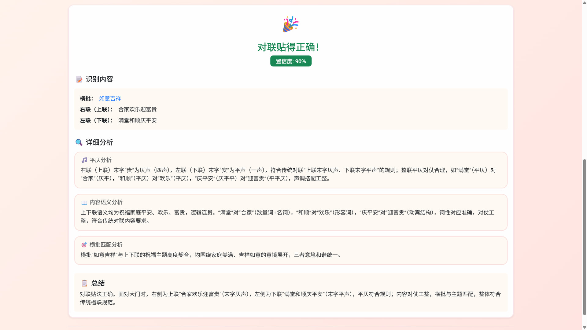 有了该程序,由 AI 来判断对联有没有贴反,并且给出具体分析,就算有人说你错了,你也由足够的论据去反驳赢回一局