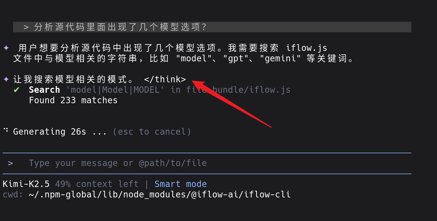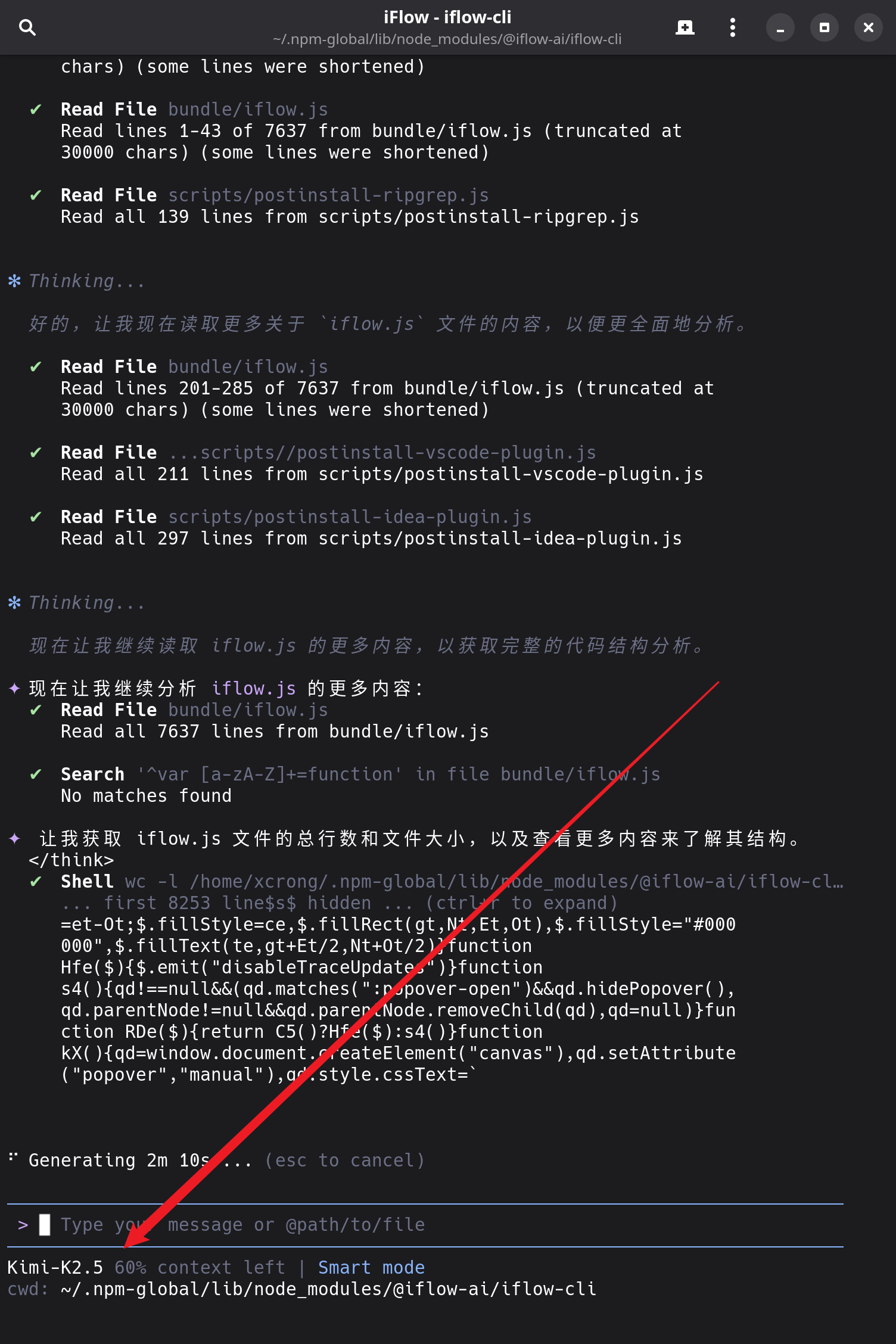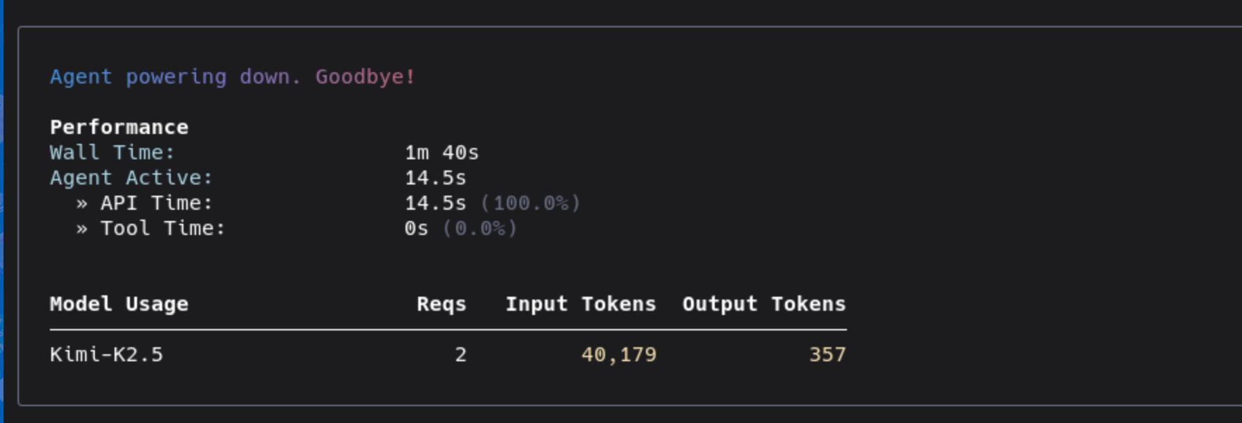 本来只是好奇,把本地 node_modules 下面的源文件,查找替换了 Kimi-K2-0905 为 Kimi-K2.5 ,我想着发布这么久了,也该上线了,不上线也该测试了。没想到真的能请求。不过似乎效果很差,工具调用用不好,应该是还没适配好,现在能用也没啥用其实。