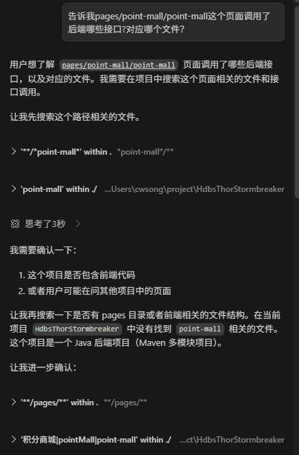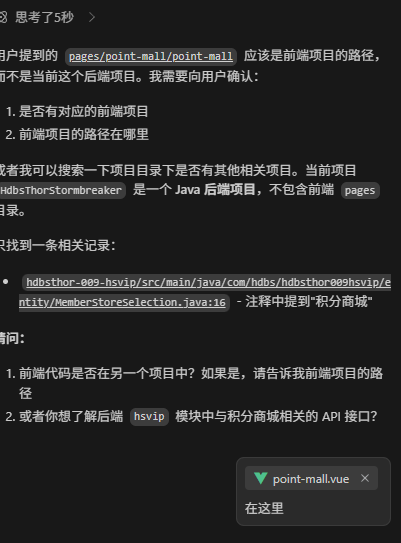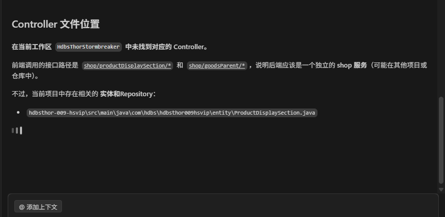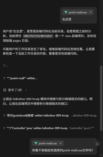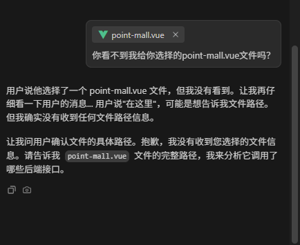 我在这里添加了上下文,让他查找这个小程序页面用到的接口在哪个controller,结果就是我上面说的,他只能读到第一个目录,后面的读取不到(就算我指定了vue文件)