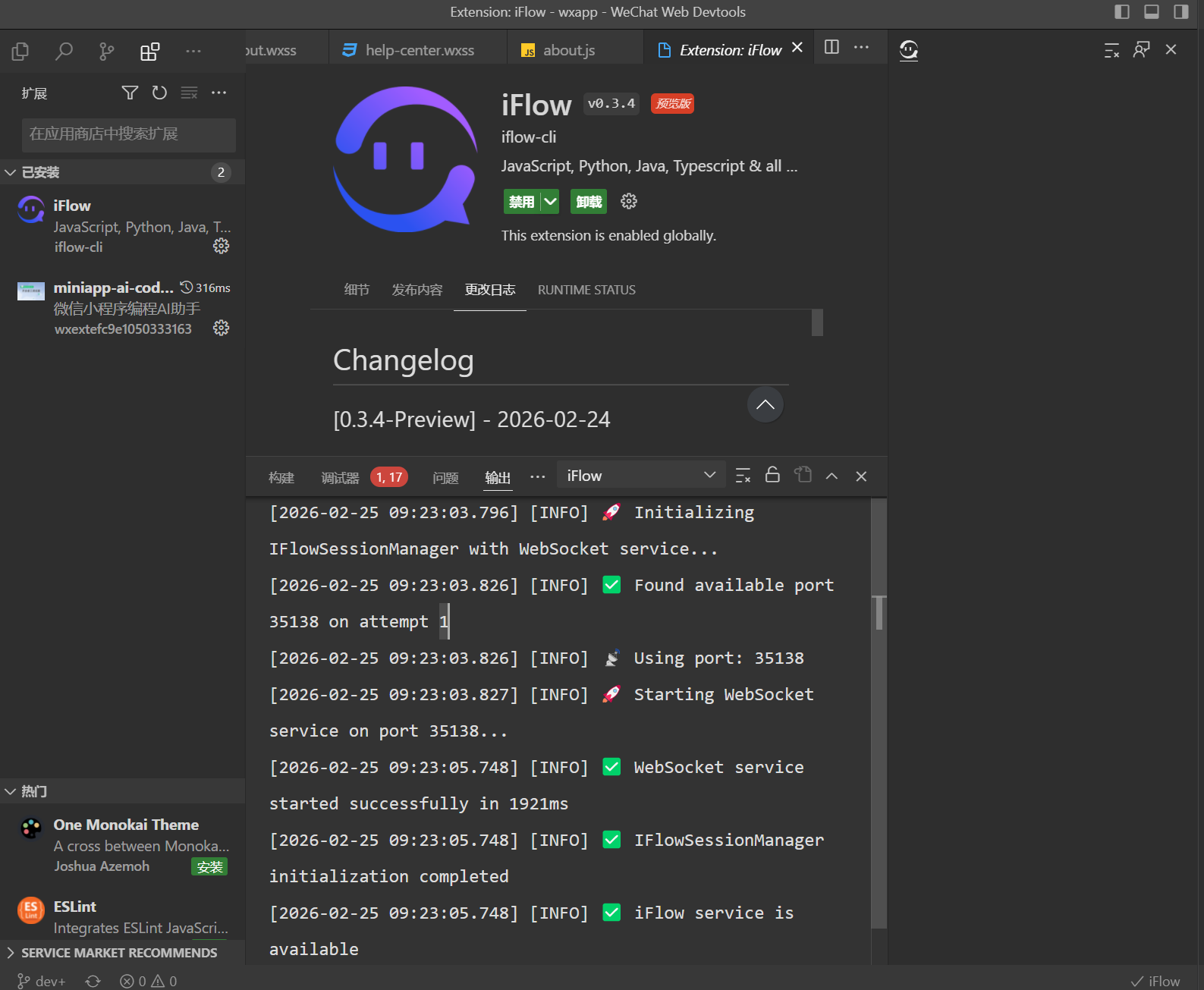 D:\Program Files\Tencent\微信web开发者工具\code\package.nw\js\libs\vseditor\bundled\editor.bundled.js:9 Activating extension 'iflow-cli.iflow-cli-vscode-ide-companion' failed: n.window.onDidChangeTerminalShellIntegration is not a function.