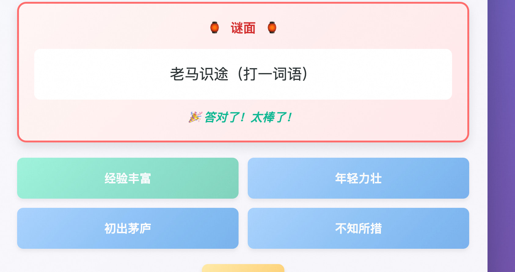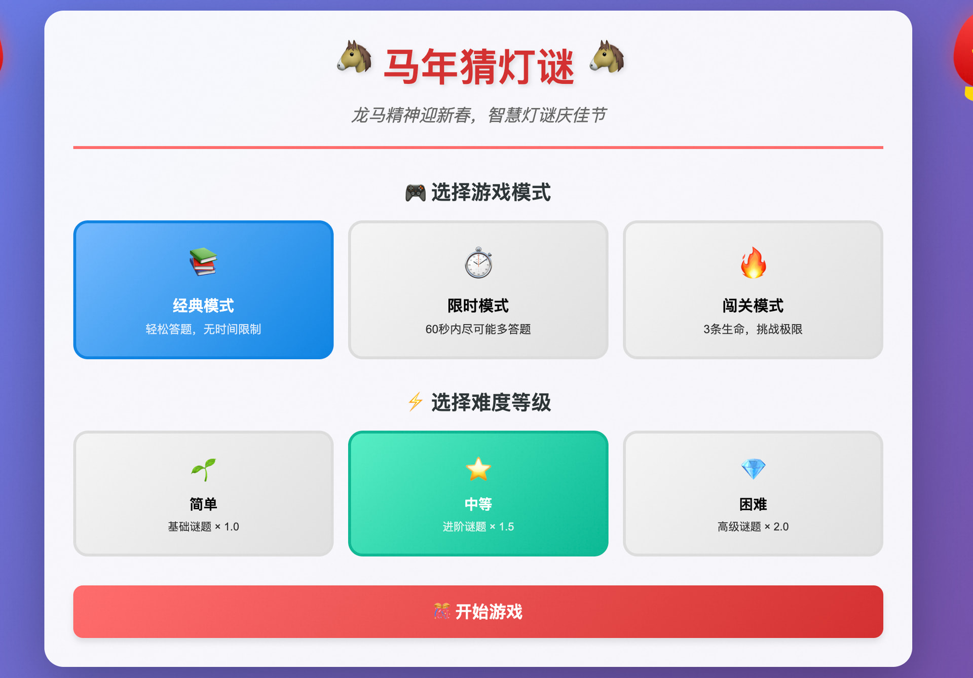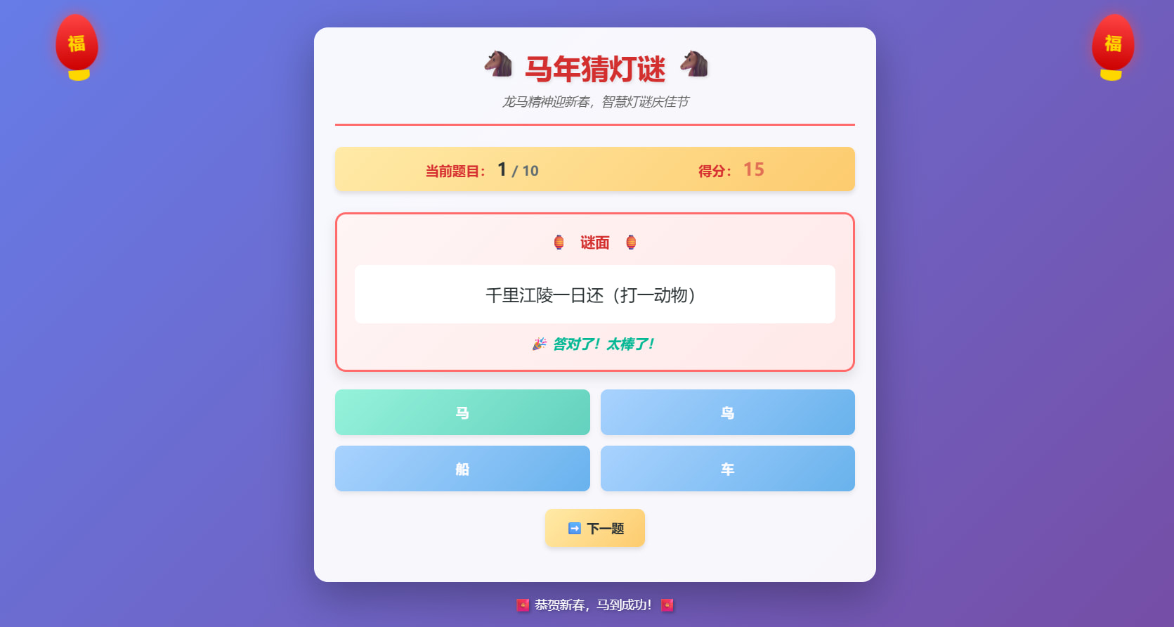 这是一个基于纯 HTML、CSS 和 JavaScript 开发的新春主题猜灯谜游戏。游戏以马年为主题,融合了中国传统文化元素,通过精美的视觉设计和流畅的交互体验,为用户带来一场充满年味的智力挑战。