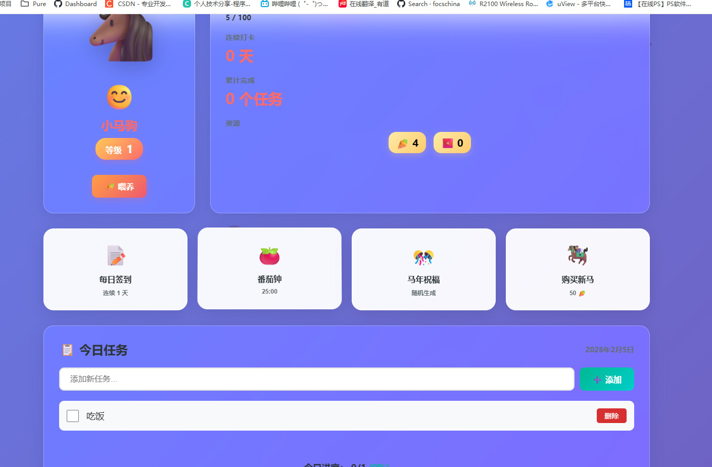一款融合游戏化、马年元素和自律管理的创新型习惯追踪系统。通过养马、签到、喂养、专注等趣味玩法,让自律变得有趣又有成就感!