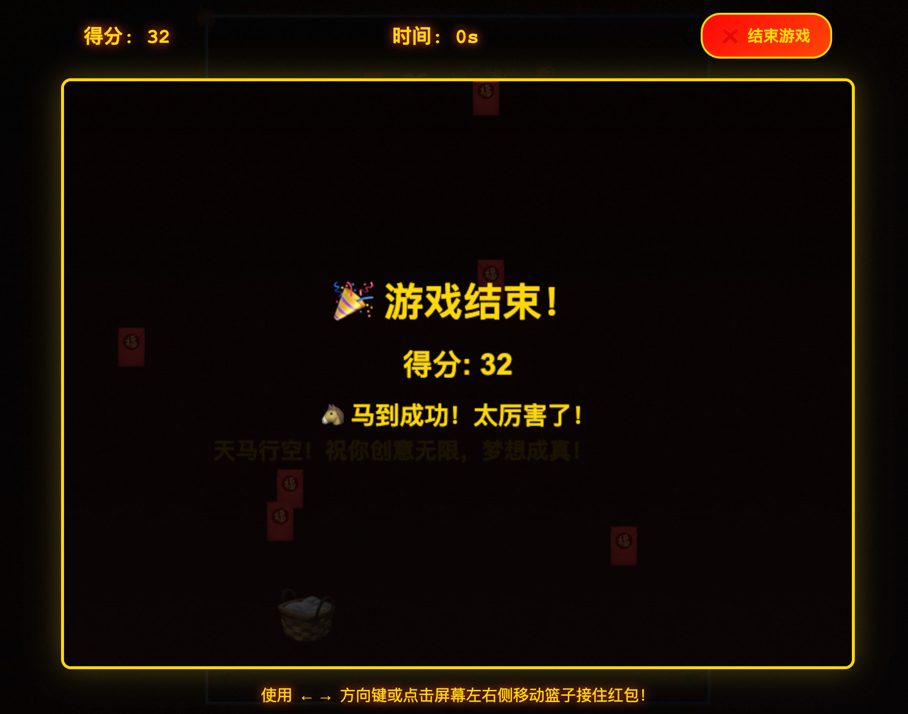 这是一个纯前端实现的马年新春彩蛋网页,为 2026 丙午年(马年)特别制作!融合了精美的 SVG 艺术、动态装饰效果和趣味小游戏,带来喜庆热闹的春节氛围。