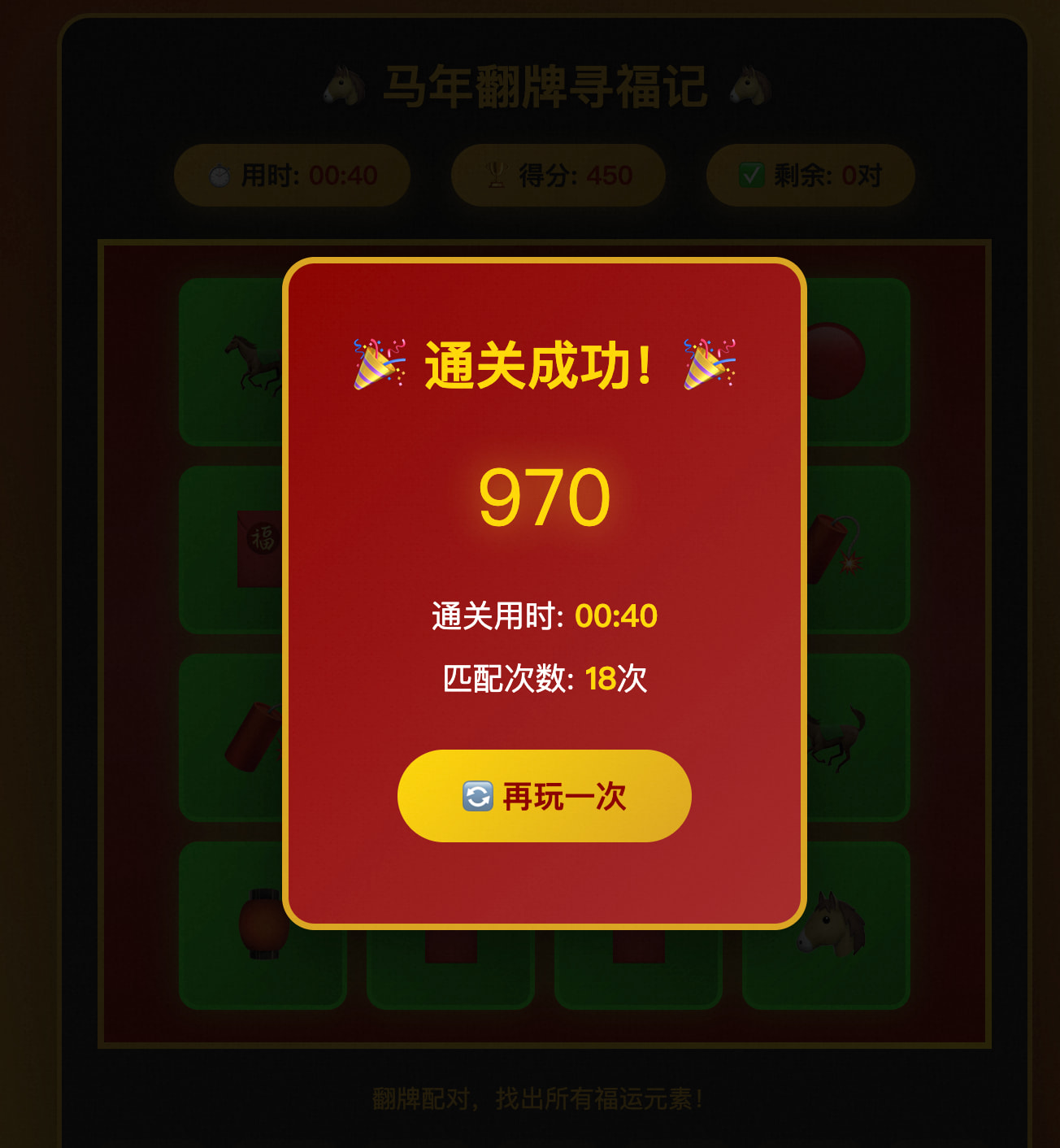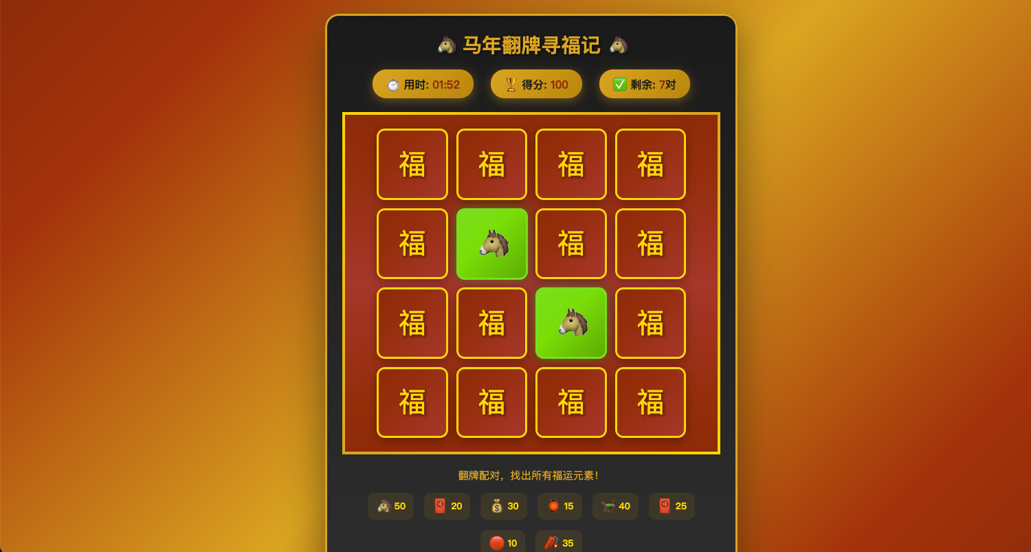 马年翻牌寻福记 - 经典记忆翻牌配对(★★★☆☆ 轻度脑力)