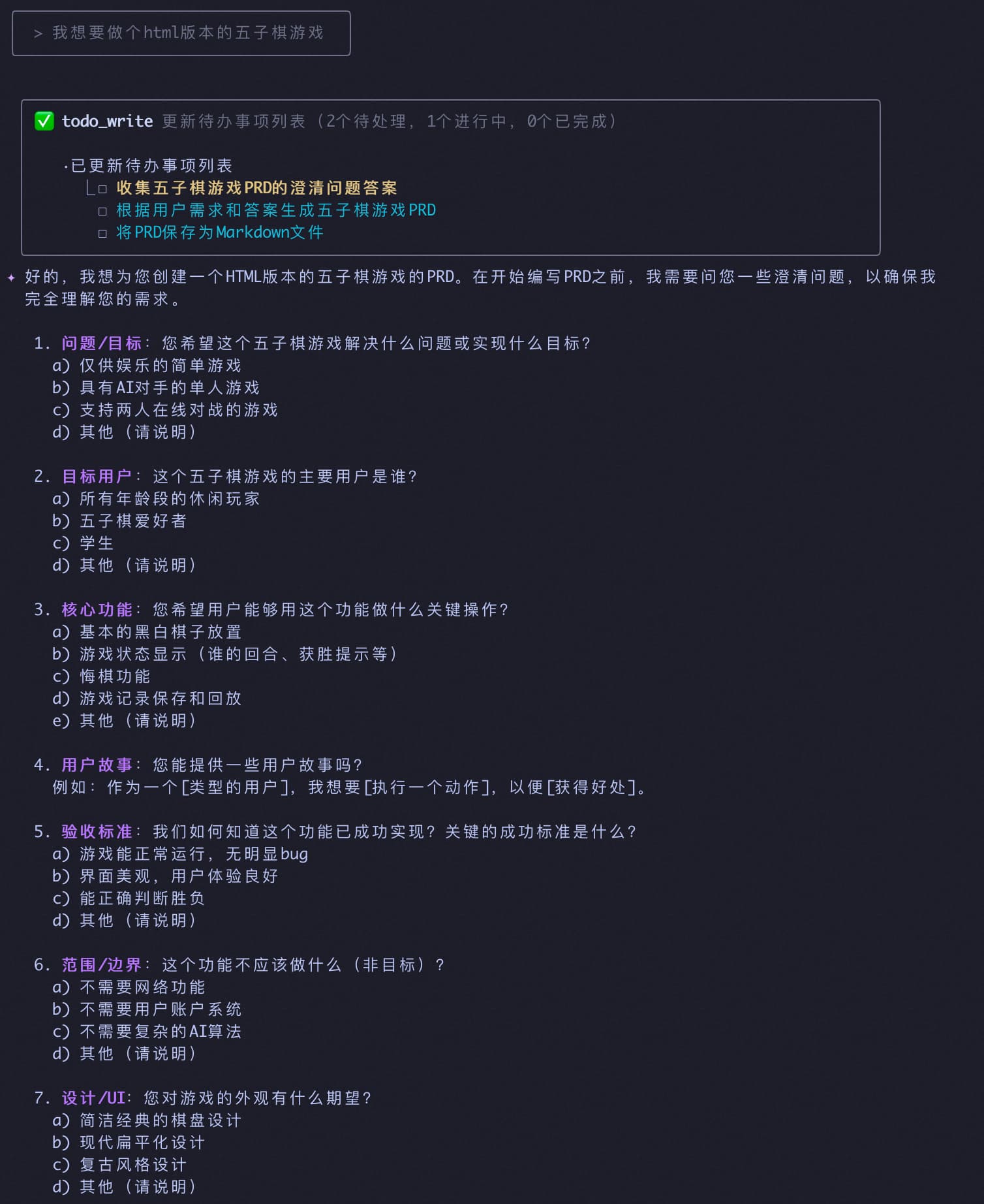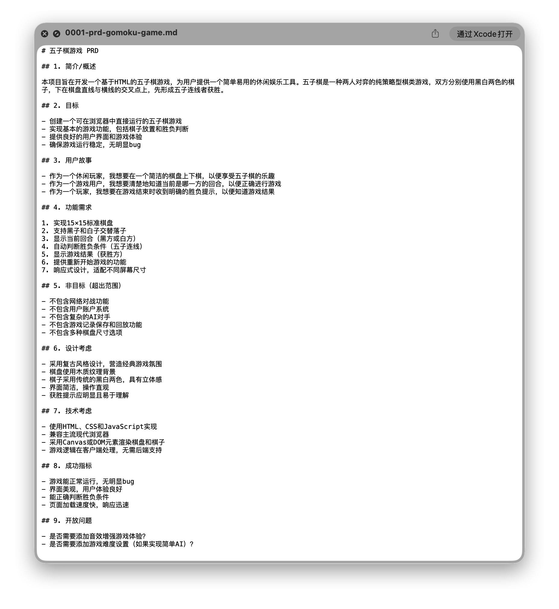然后他就一顿操作,帮我们生成出具体的PRD文档,放置在0001-prd-gomoku-game.md,我简单阅读了一下,还是比较清晰的,可以手动改一些文案,然后保存。