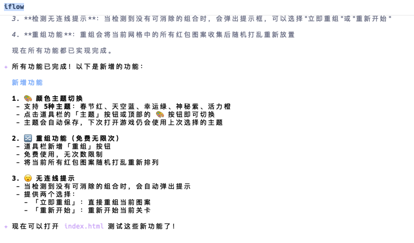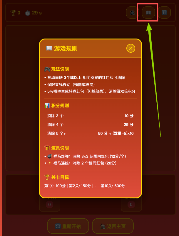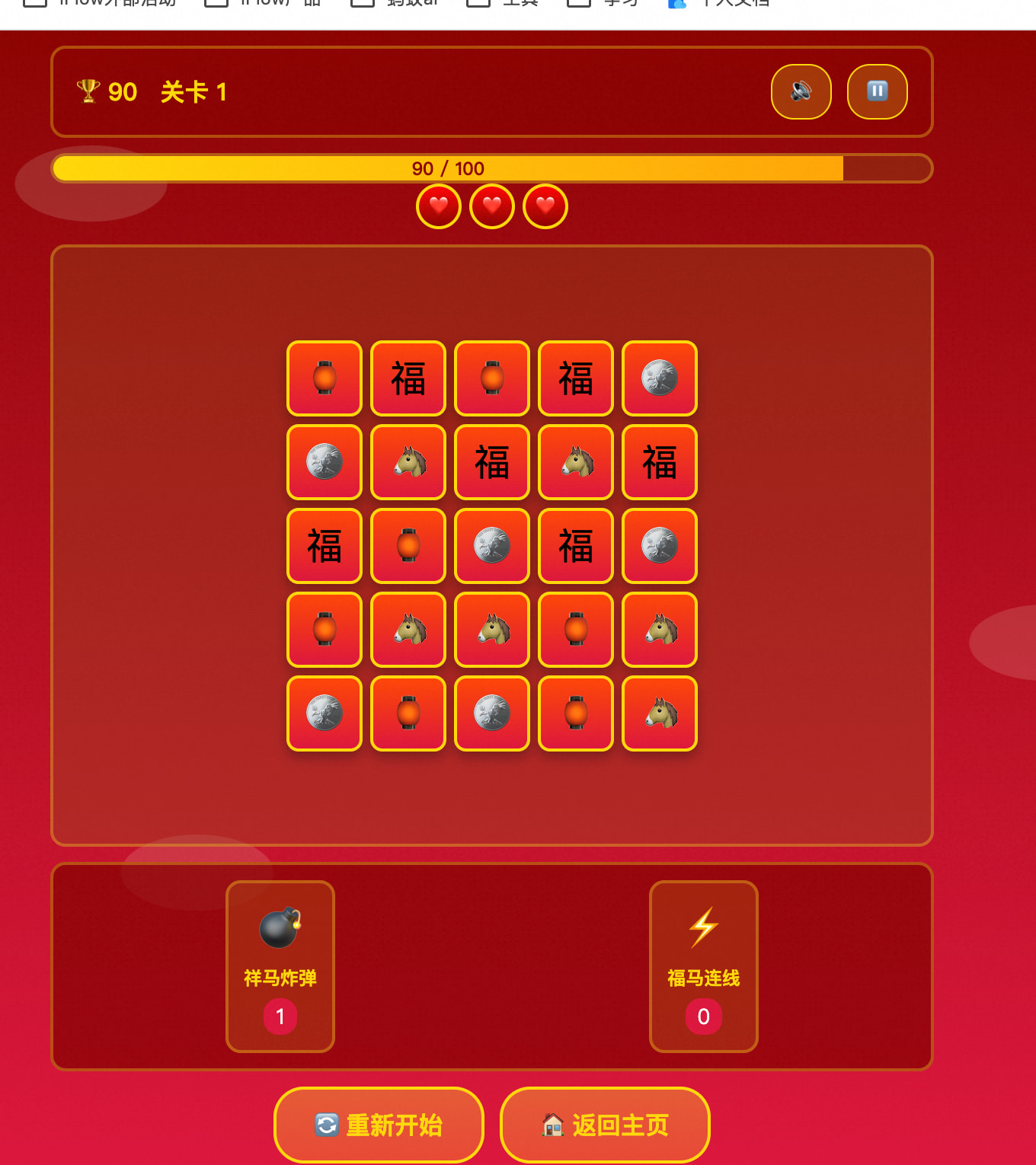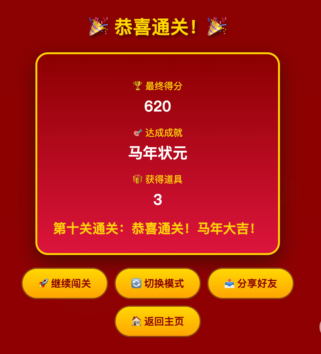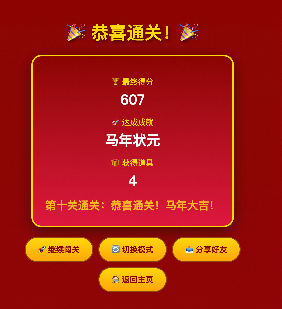 这款游戏不仅实现了所有需求功能,还通过丰富的视觉特效、流畅的交互体验和合理的游戏平衡,为玩家带来了新春佳节的欢乐氛围。游戏简单易上手,又有足够的挑战性,适合全年龄段用户,完美契合"接福纳祥"的主题。