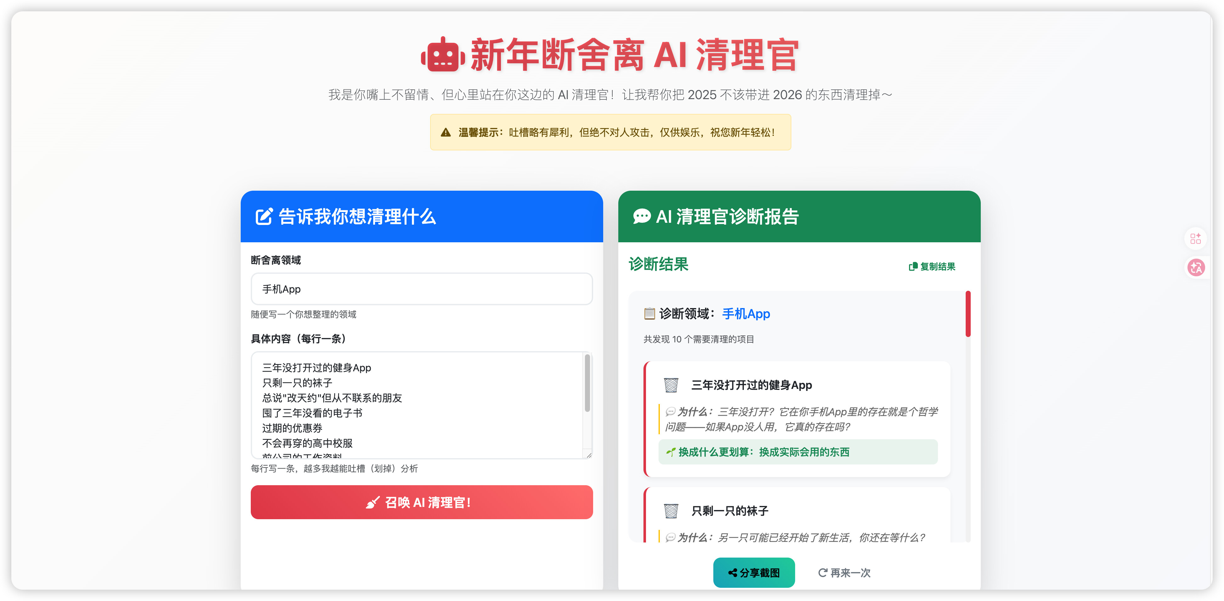 新年断舍离 AI 清理官 是一个基于 Web 的互动应用,用户输入想要清理的领域和具体项目,AI 清理官会以"嘴上不留情、但心里站在用户这边"的风格,给出幽默的清理建议。