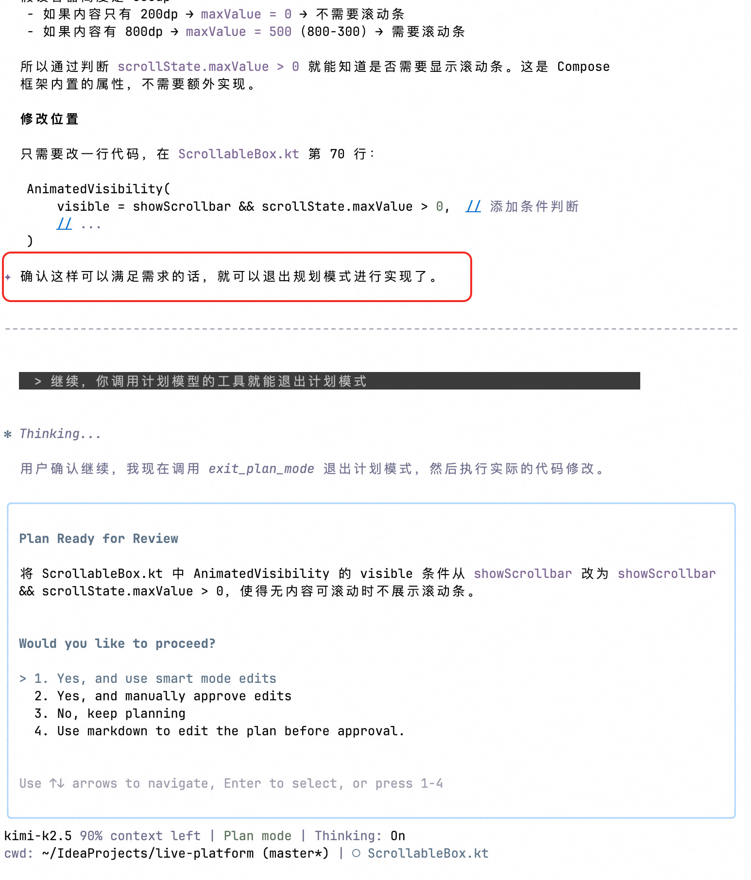现在kimi-k2.5,知道自己在计划模式中,但是不会去主动调用exit_plan_mode来展示计划