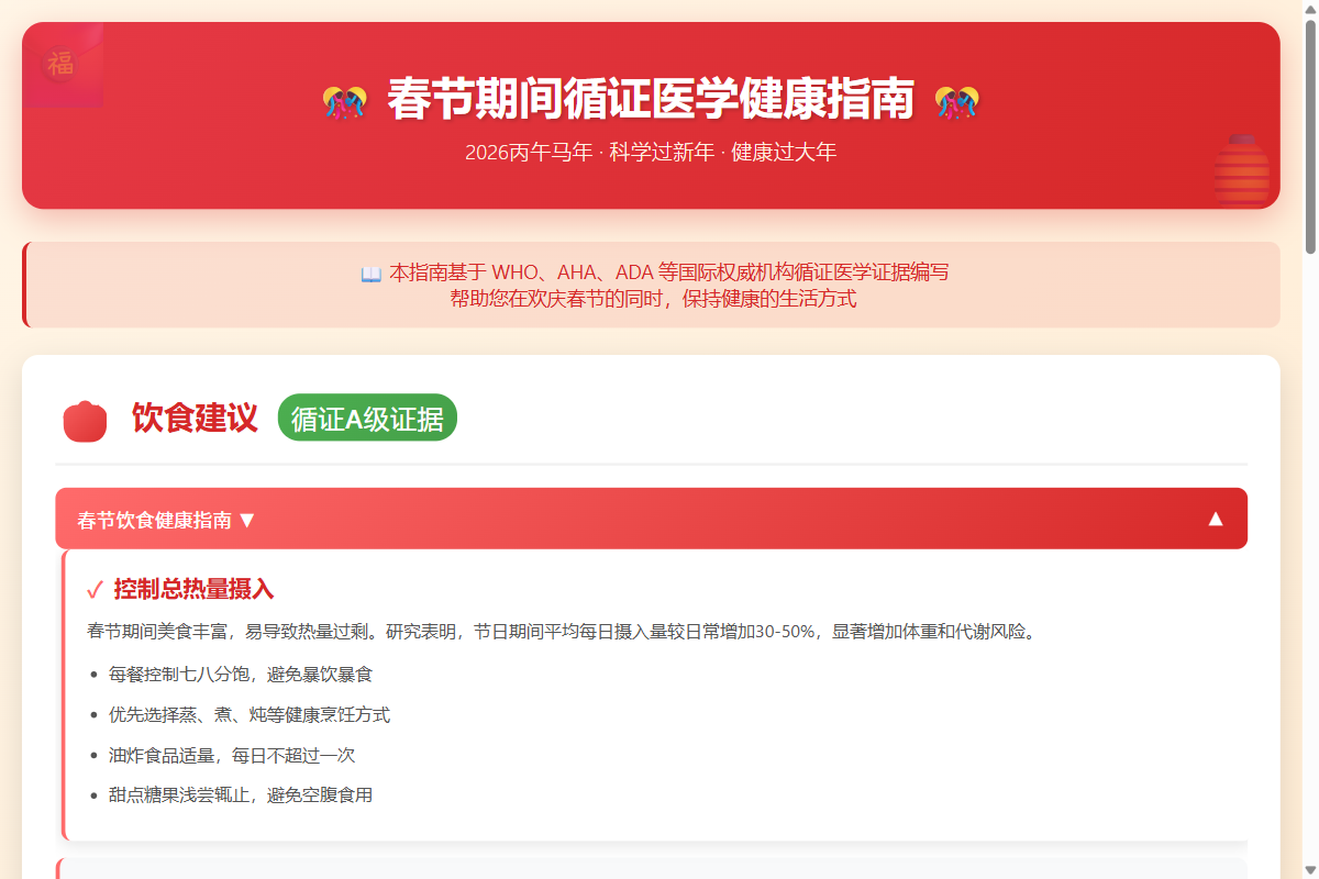 这是一个春节期间循证医学健康指南网页,帮助大家在欢庆春节的同时保持健康的生活方式。项目基于 WHO、AHA、ADA 等国际权威机构循证医学证据编写,涵盖饮食、饮酒、用药、慢性病管理等全方位健康指导。