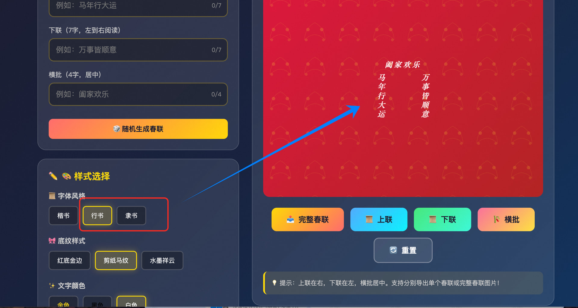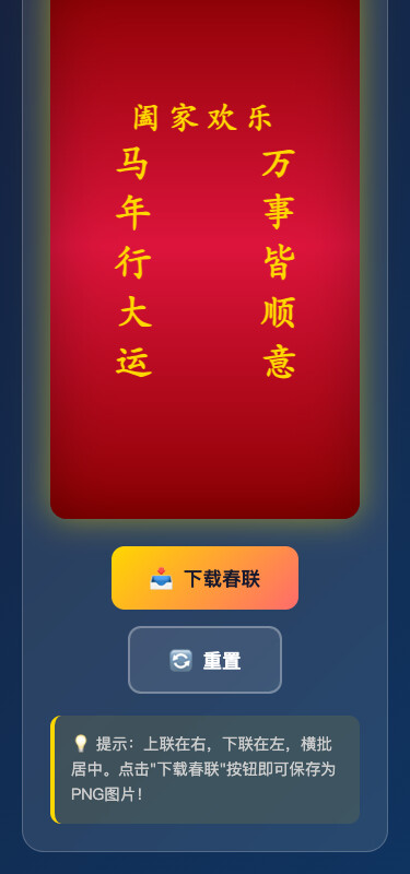「马年挥毫写春联」是一个可视化春联生成器,支持用户自定义上联、下联、横批内容,选择字体、底纹和颜色样式,实时预览效果,并可将春联导出为高清 PNG 图片。