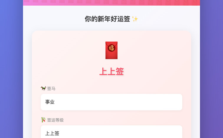 展示签运等级、关键词、好运提示和解签词,帮助用户获得积极而理性的新年指引。
