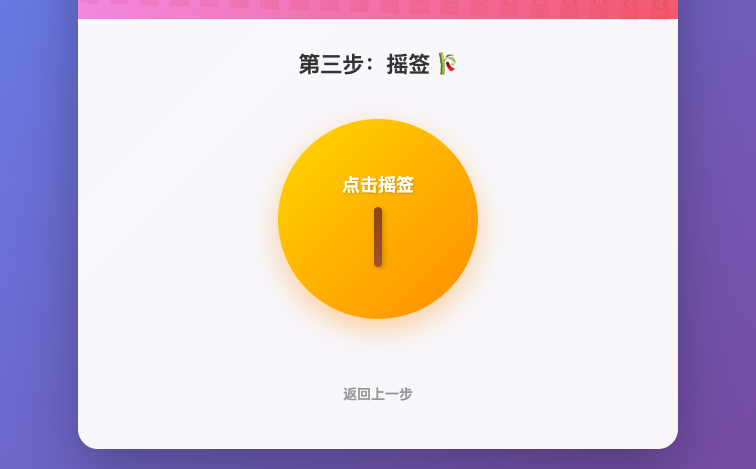 CSS 关键帧动画 shakeStick1/2/3 模拟竹签摇动效果,摇签过程持续 2.5 秒,增强仪式感。