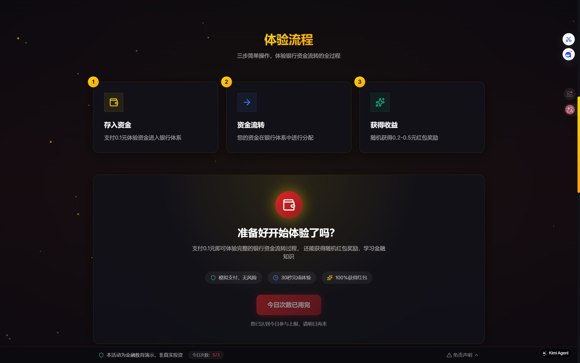 您可以点击"存入0.1元 开启体验"按钮测试完整的支付流程!