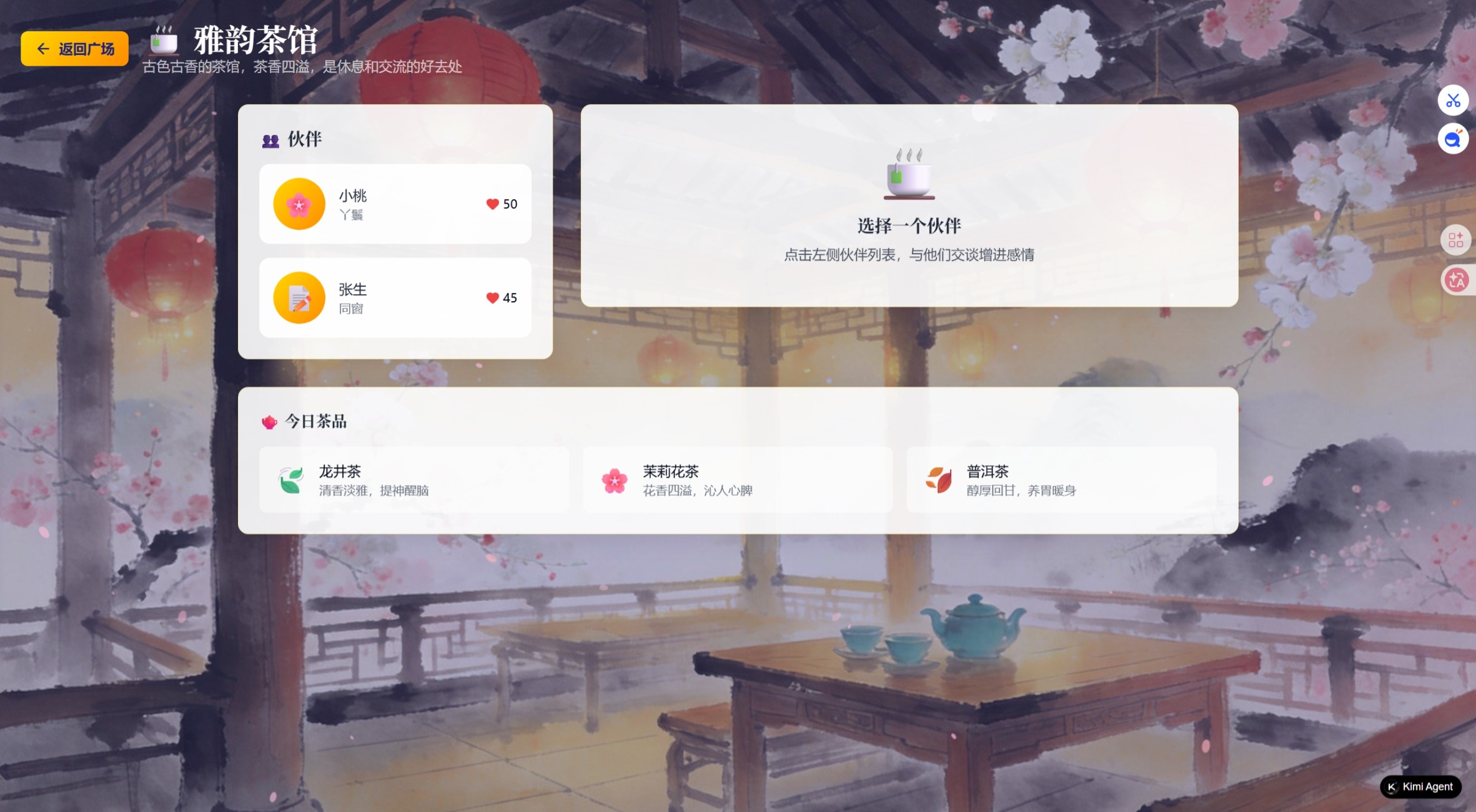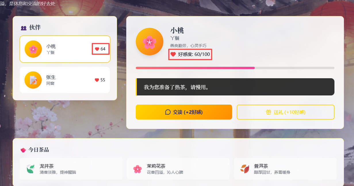 氛围渲染:窗外飘落的花瓣,茶烟袅袅的粒子特效