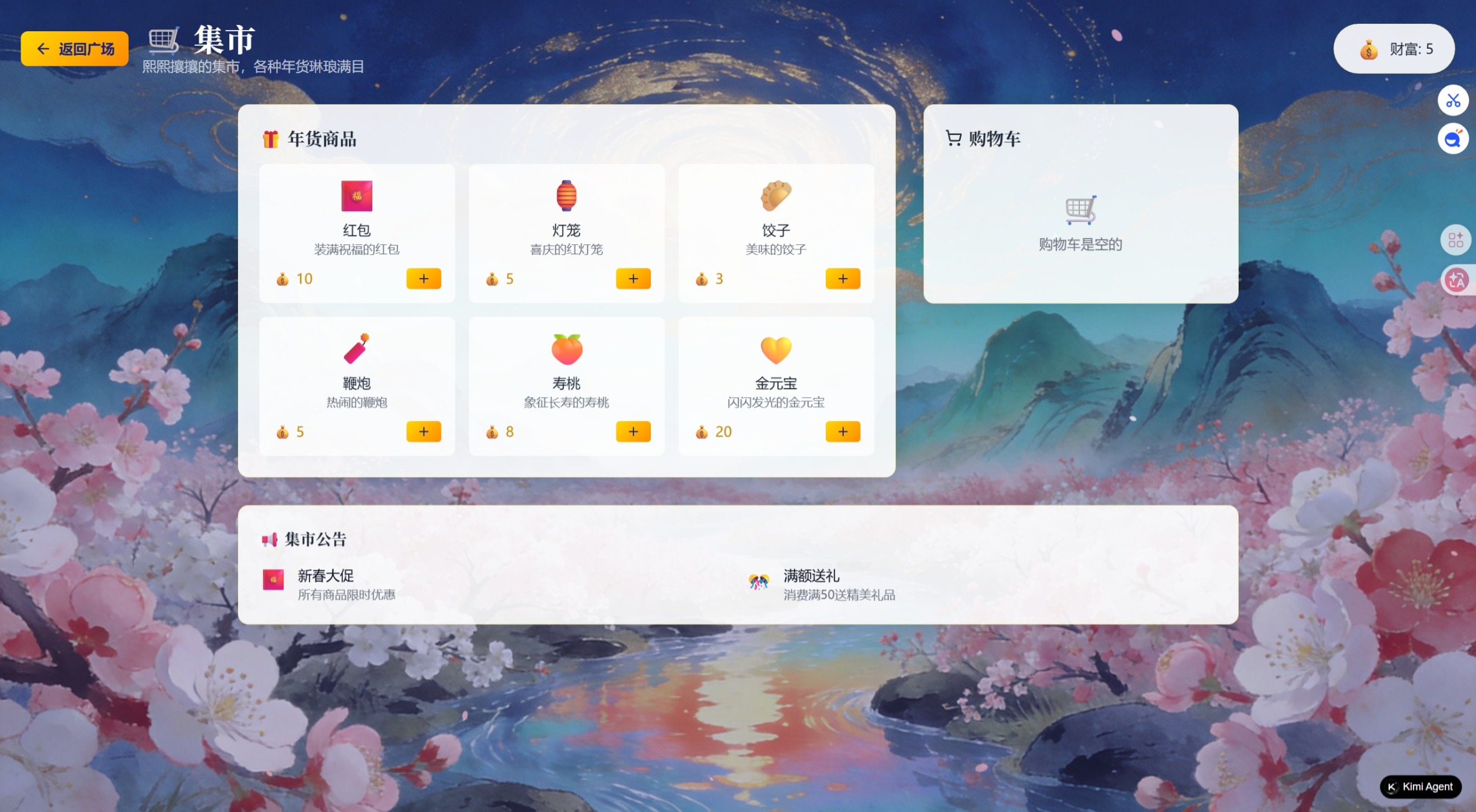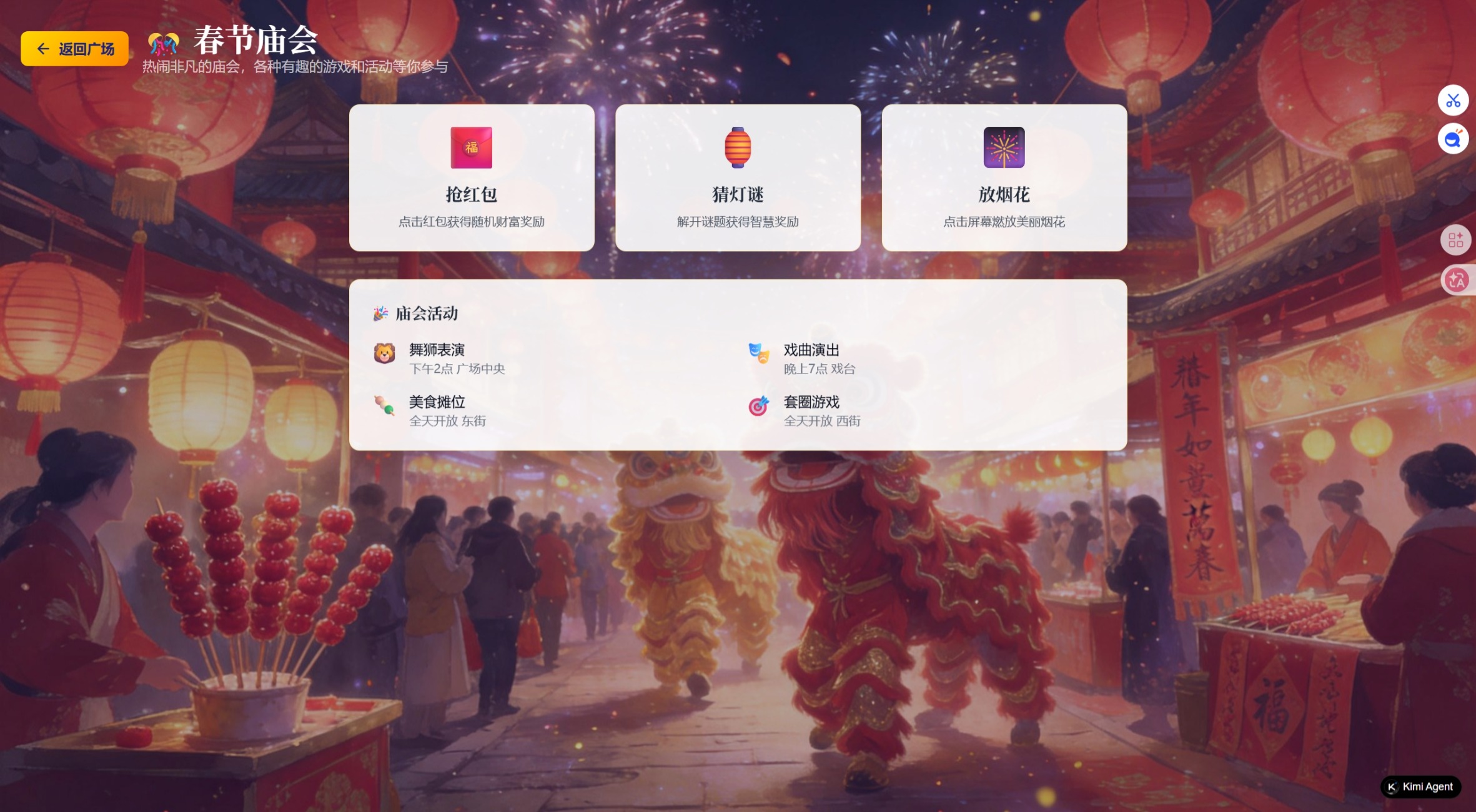 这是一款融合传统春节文化与现代RPG玩法的沉浸式网页游戏。当深蓝夜空中绽放第一朵烟花,当雪花与花瓣在金色光晕中交织飞舞,你将踏入一个如梦似幻的国风世界——在这里,每一次选择都将编织出独一无二的春节记忆。