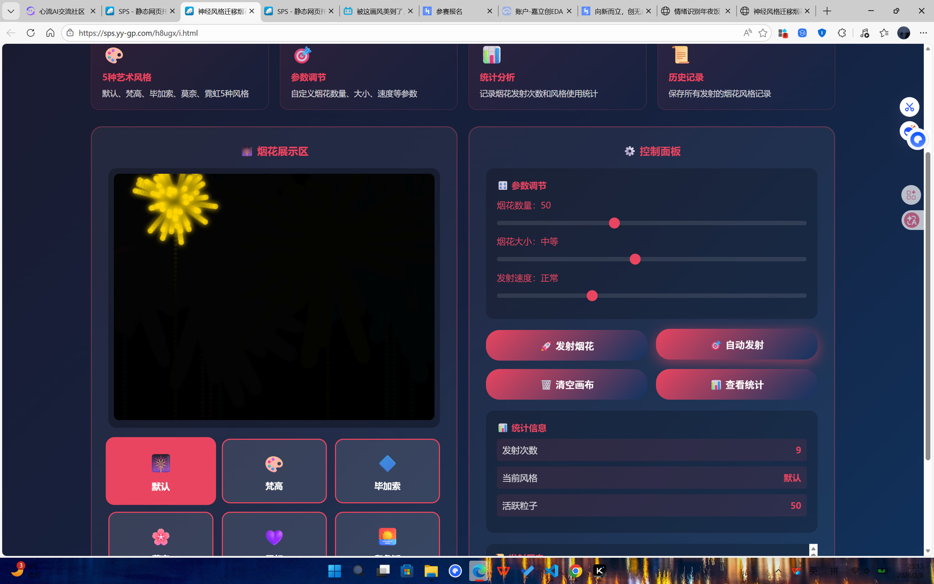 上传任意图片,实时将其艺术风格迁移到烟花爆炸形态中,展示梵高风格、毕加索风格、莫奈风格、霓虹风格的烟花。