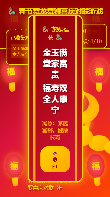 这是一个充满年味的春节主题小游戏,通过点击舞动的龙和狮来收集喜庆的对联。游戏融合了传统春节文化与现代网页技术,让玩家在游戏中感受春节的欢乐氛围。