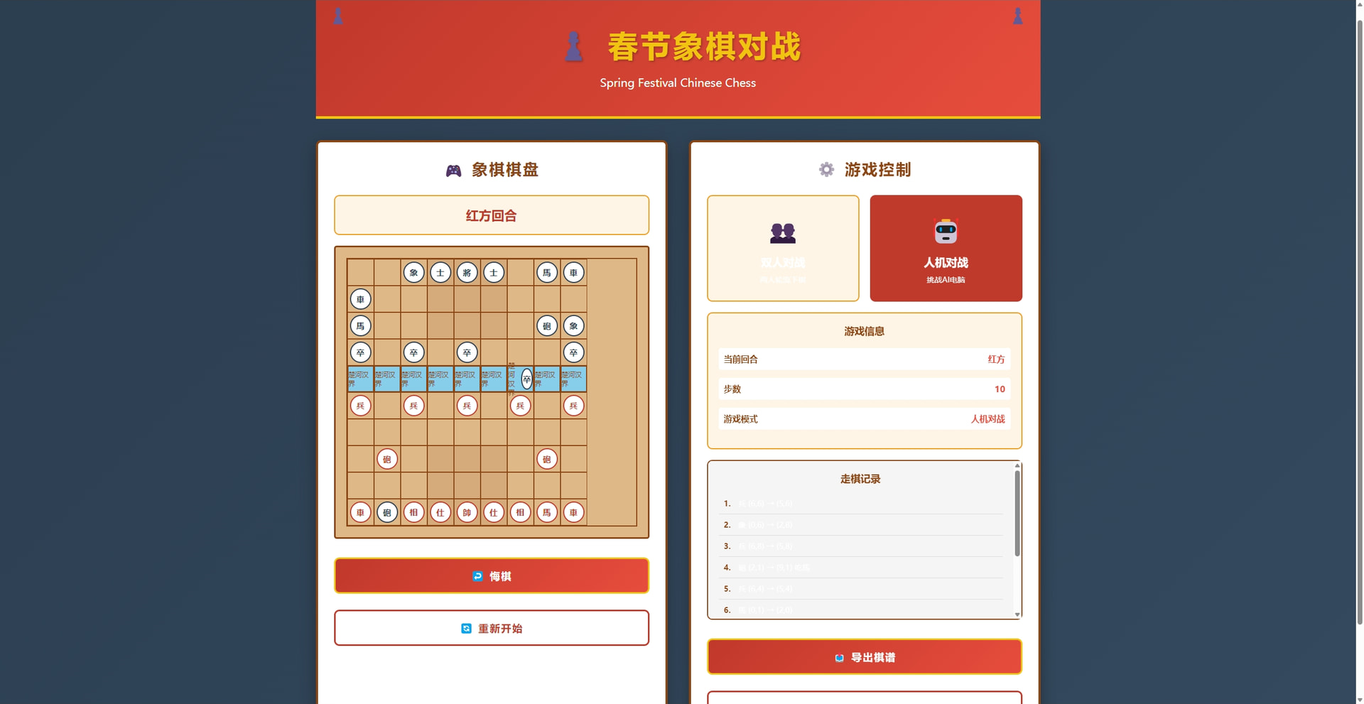 - 主内容区:9x10格象棋棋盘、游戏状态显示、操作按钮