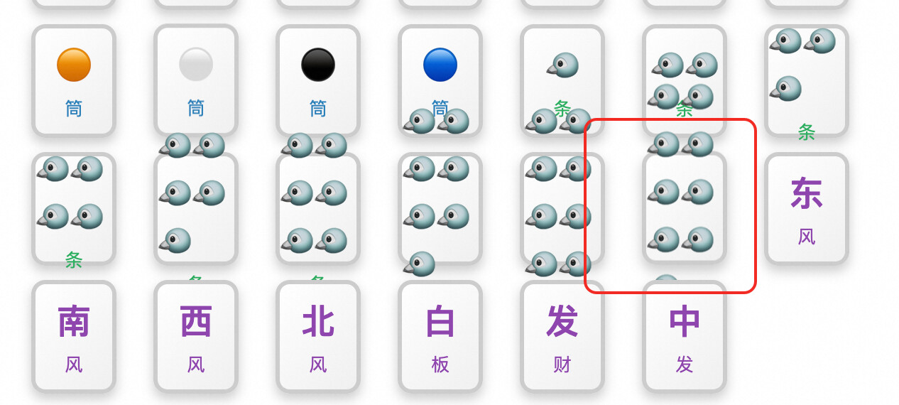 - 条子牌:绿色,上方显示鸟的数量,下方显示"条"