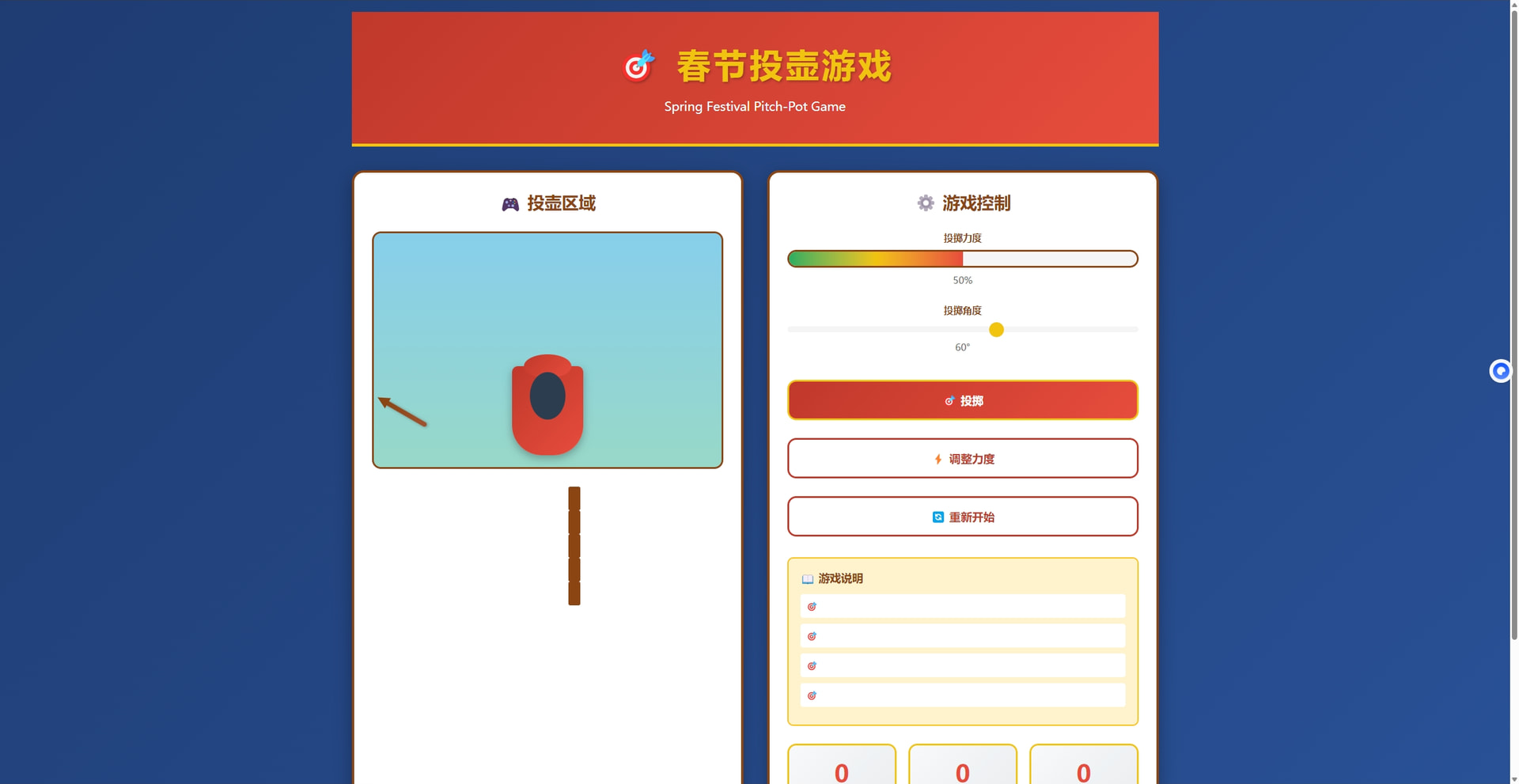 春节投壶游戏是一个民俗游戏主题的互动游戏项目,还原了古代投壶这一传统游戏。项目采用蓝色背景和木纹风格设计,提供投掷力度控制、角度调整、箭矢管理等功能,让用户在游戏中体验古代投壶游戏的魅力。