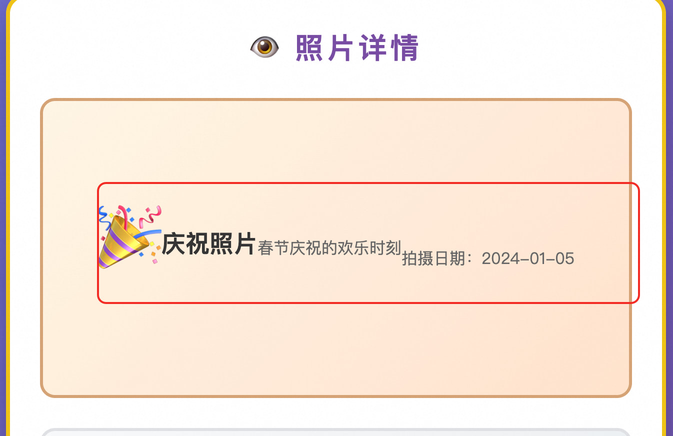 春节互动相册是一个社交互动主题的相册分享平台,让用户可以上传和分享春节照片。项目采用相册风格设计,提供照片上传、相册管理、照片浏览、评论互动等功能,让用户在分享中记录春节的美好时刻。
