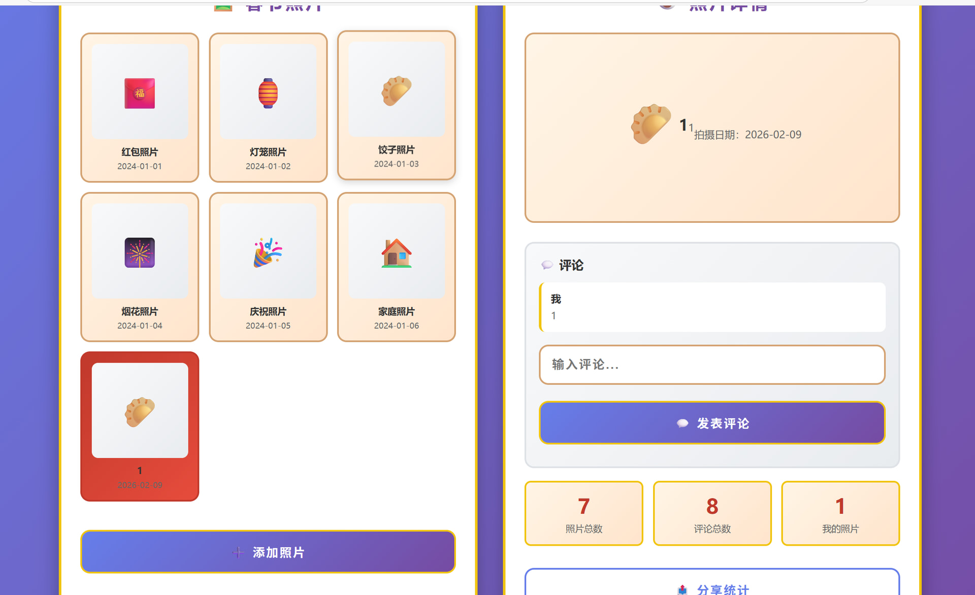 春节互动相册是一个社交互动主题的相册分享平台,让用户可以上传和分享春节照片。项目采用相册风格设计,提供照片上传、相册管理、照片浏览、评论互动等功能,让用户在分享中记录春节的美好时刻。