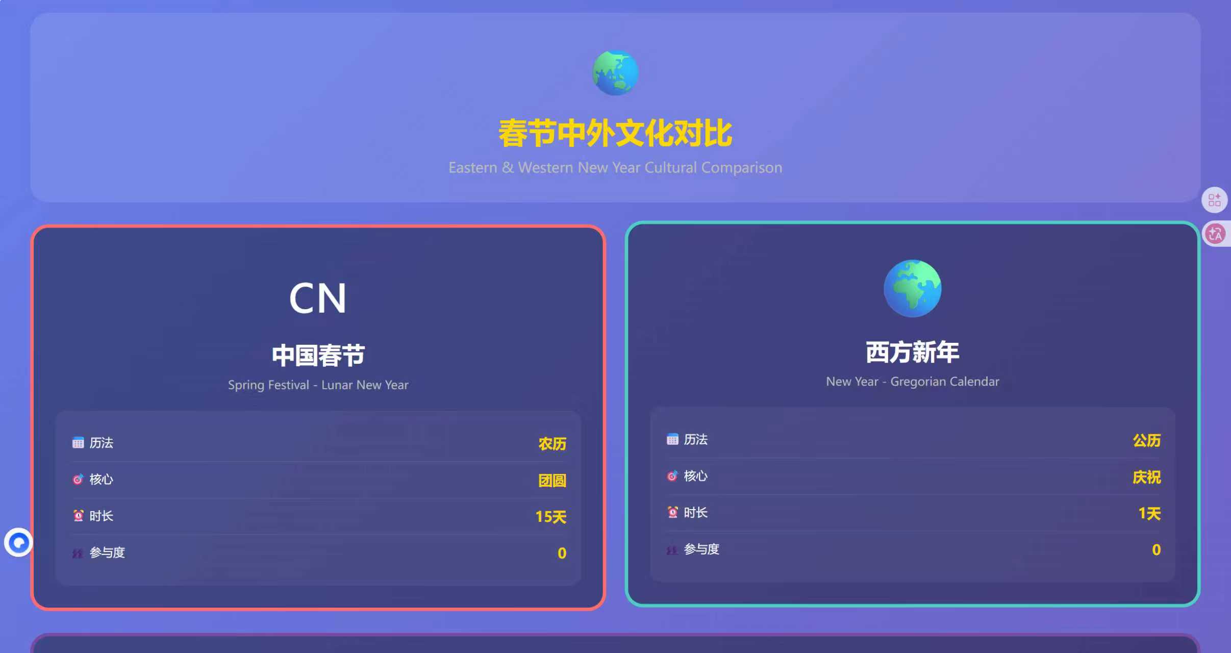 春节中外文化是一个中外文化对比与融合的互动教育项目,系统展示中国与西方在春节和新年方面的文化差异与融合。项目采用对比风格,通过饮食文化、节日习俗、礼物文化和节日时间等功能,普及中外文化知识和跨文化理解。
