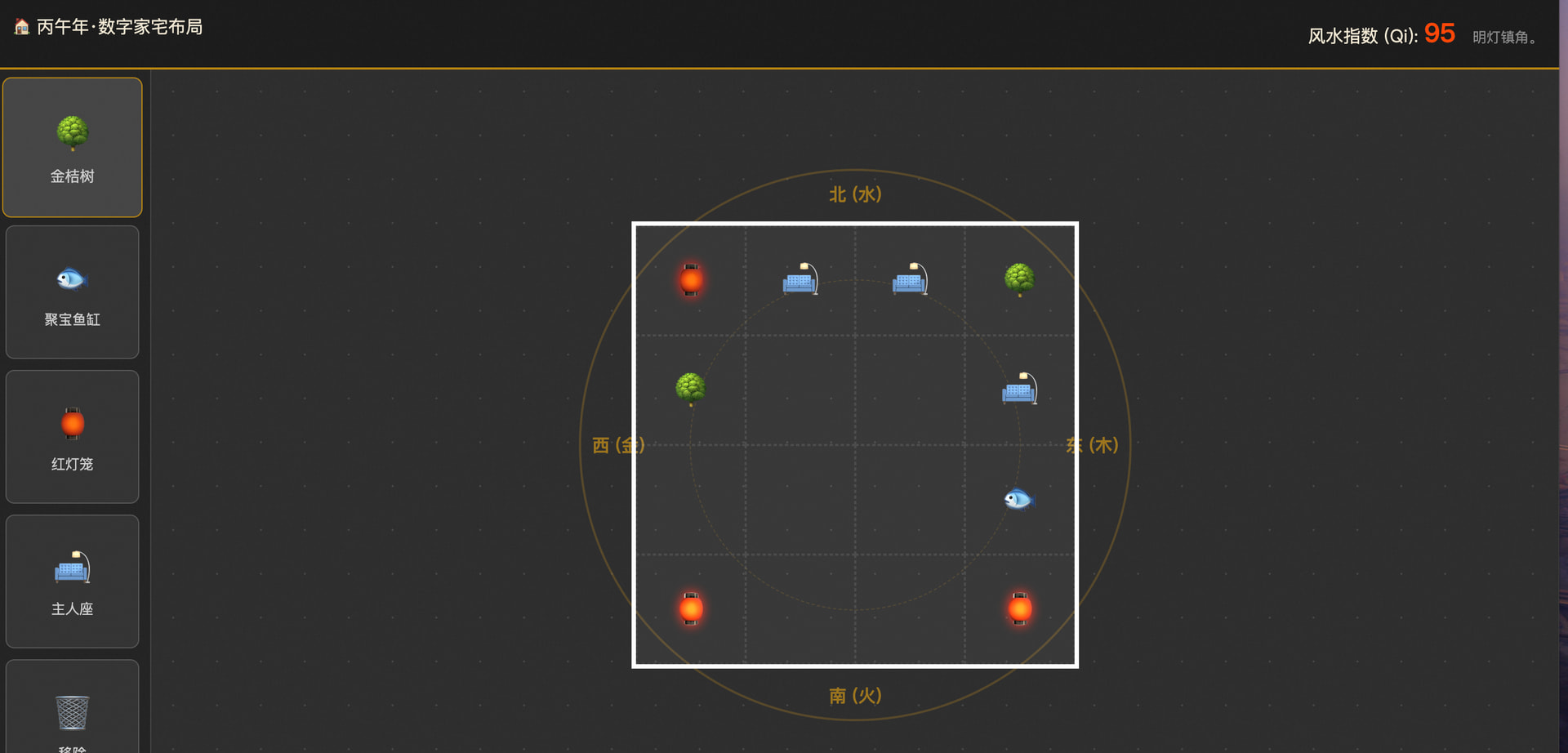 > 一个基于网格的交互式春节装饰规划工具,融合传统风水智慧与现代空间设计美学。